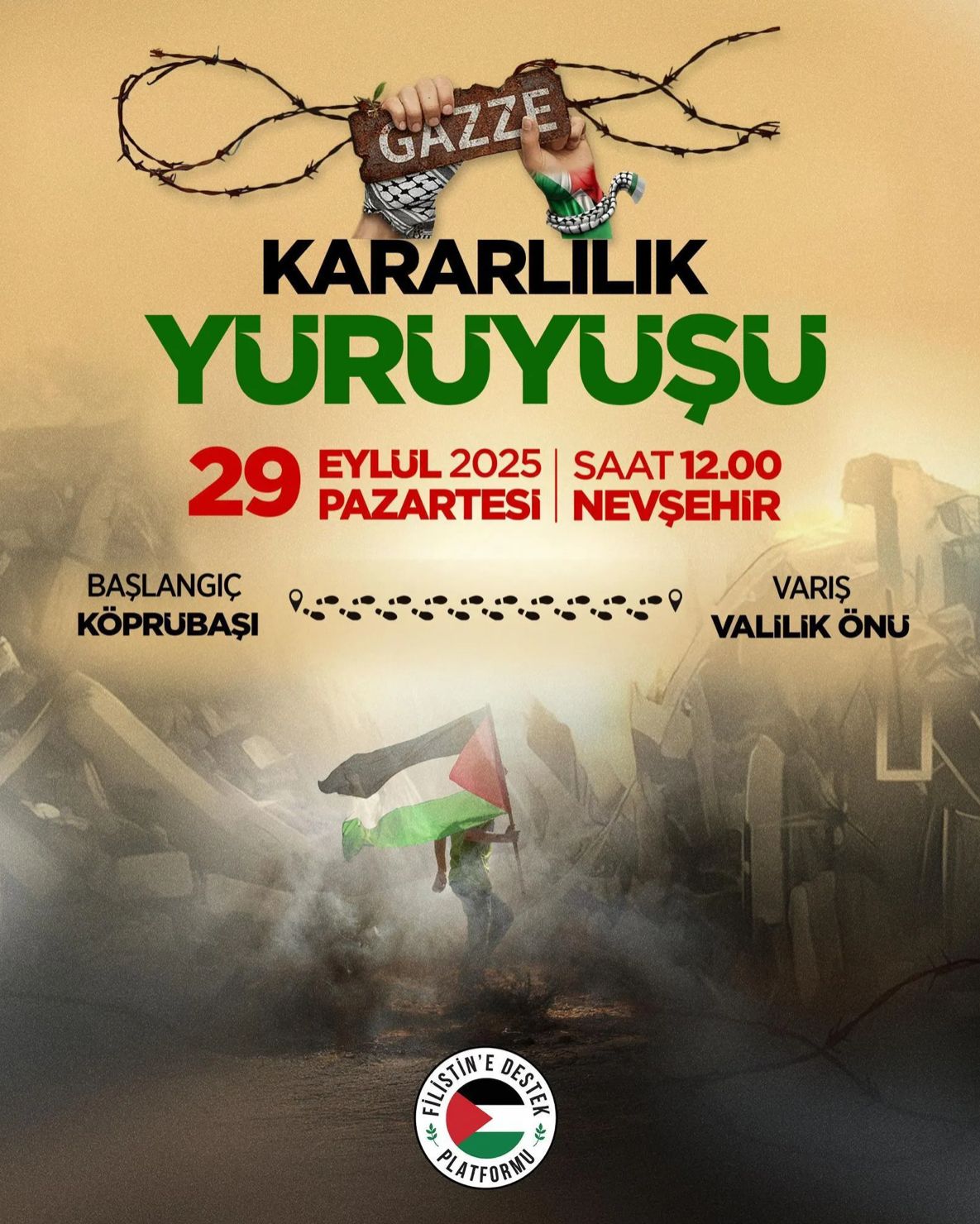 Filistin’e Destek Platformu öncülüğünde Nevşehir’de “Gazze Kararlılık Yürüyüşü” gerçekleştirilecek. 29 Eylül 2025 Pazartesi günü yapılacak yürüyüş, saat 12.00’de Köprübaşı’ndan başlayarak Valilik önünde sona erecek.