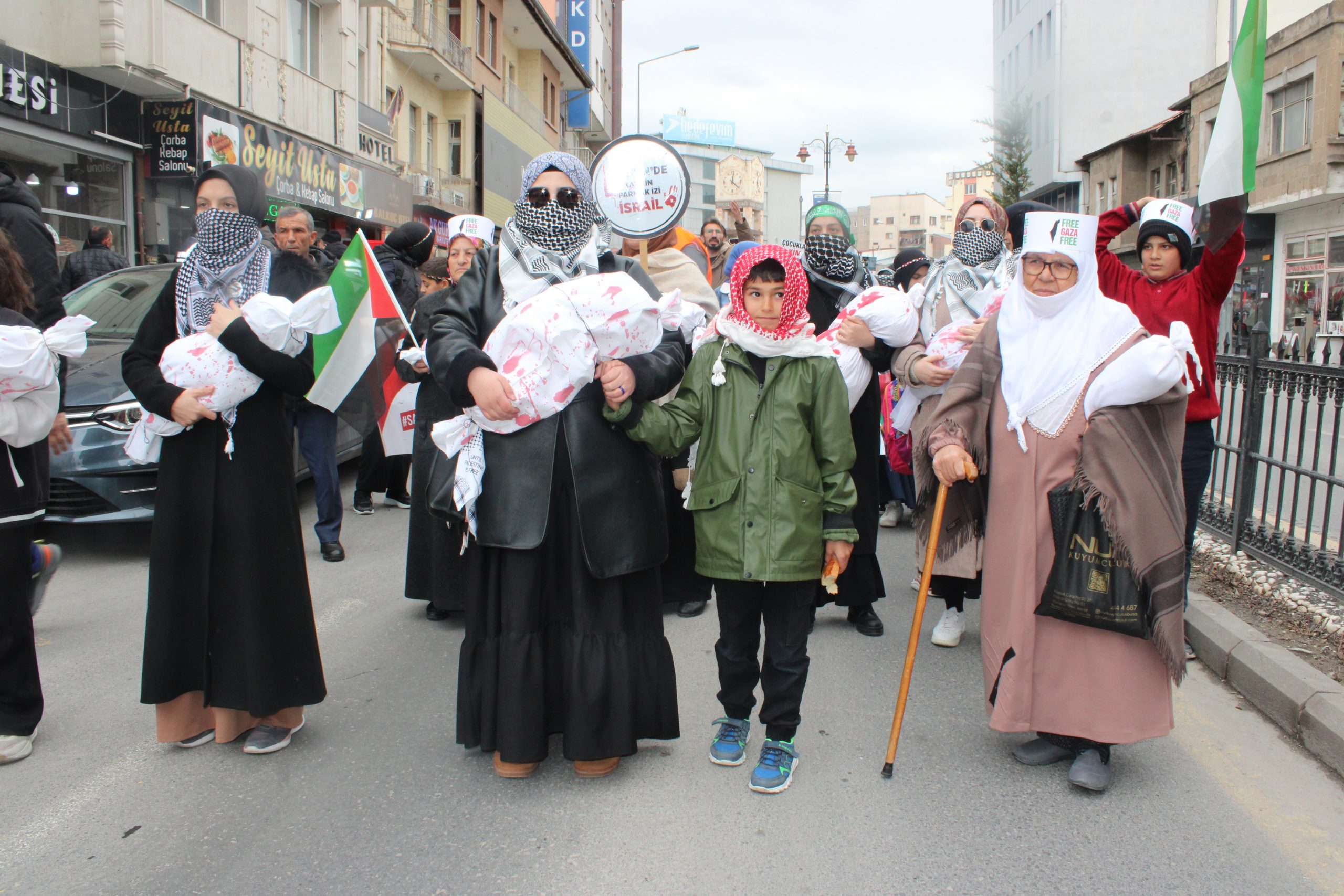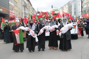 Yürüyüşün sonunda Hükümet Konağı önünde toplanarak, Gazze’de hayatını kaybedenler için dualar edildi.