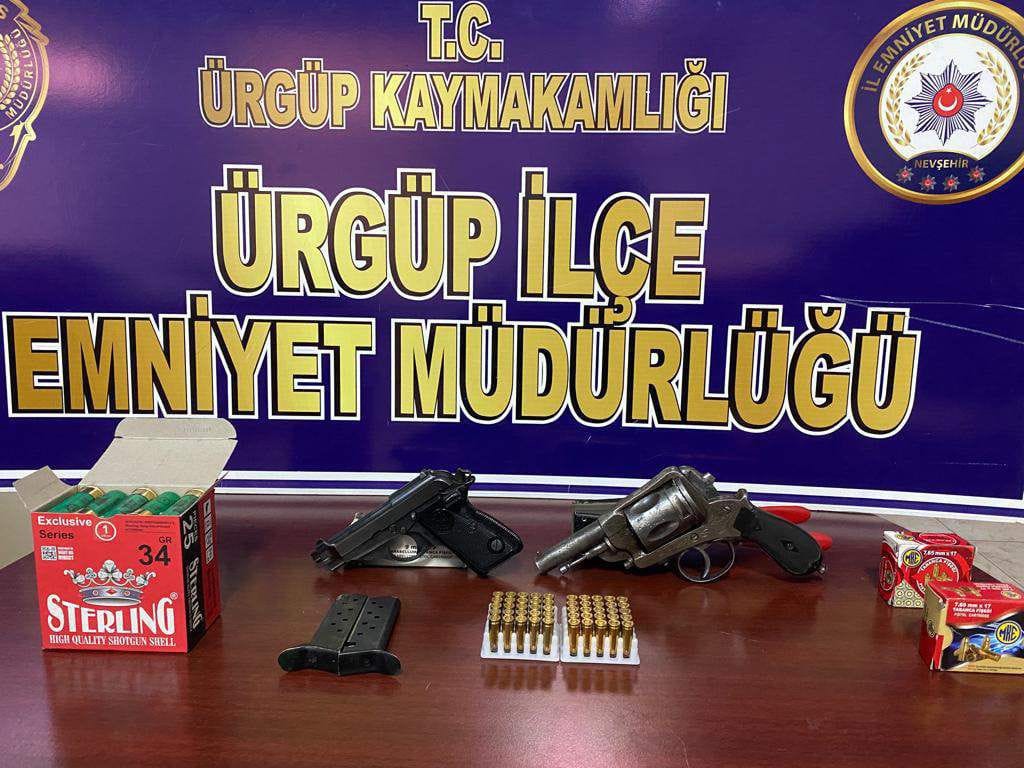 Ürgüp ilçesinde “kasten yaralama”, “kişiyi hürriyetinden yoksun kılma” ve “silahla tehdit” olayına karışan 6 şüpheli polisin titiz çalışması sonucu kısa sürede gözaltına alındı. Şüphelilerin ev ve iş yerlerinde yapılan aramalarda, 2 adet ruhsatsız tabanca ve bu tabancalara ait 50 adet fişek ile 25 adet tüfek fişeği ele geçirildi.
