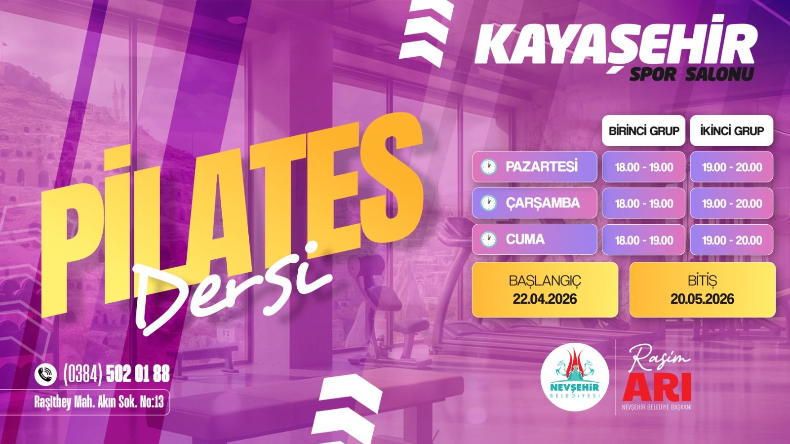 Pilates dersleri, 22 Nisan 2026 – 20 Mayıs 2026 tarihleri arasında gerçekleştirilecek. Eğitimler haftada üç gün; Pazartesi, Çarşamba ve Cuma günleri Nevşehir Belediyesi Kayaşehir Spor Salonu’nda yapılacak.