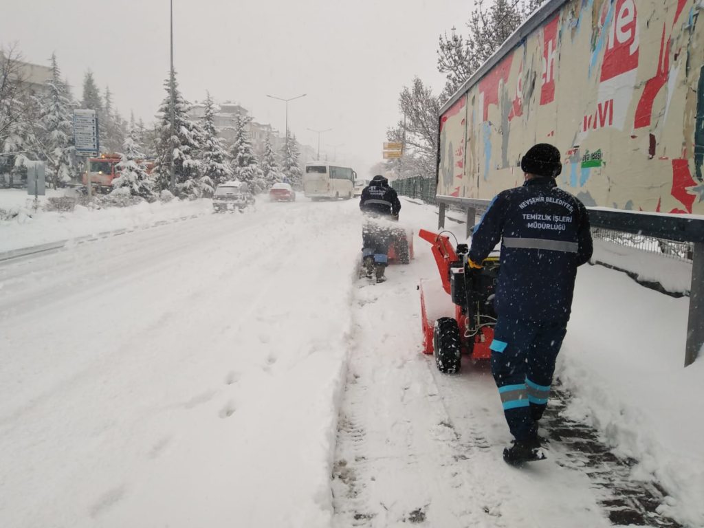 Yoğun kar yağışının yaşandığı Nevşehir’de yaya kaldırımları belediye ekipleri tarafından püskürtme özelliğine sahip kar küreme makineleri ile temizleniyor. Ekipler, yaya kaldırımlarında ayrıca tuzlama çalışması da gerçekleştiriyor.