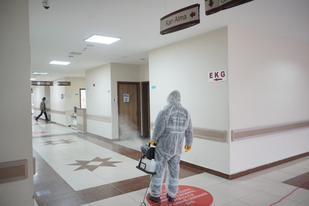 Devlet Hastanesinde korona virüs salgınına karşı özel kıyafetli ve maskeli ekiplerce, poliklinikler, koridorlar, acil servisler ve hasta bekleme salonlarında dezenfeksiyon çalışmaları yapıldı.