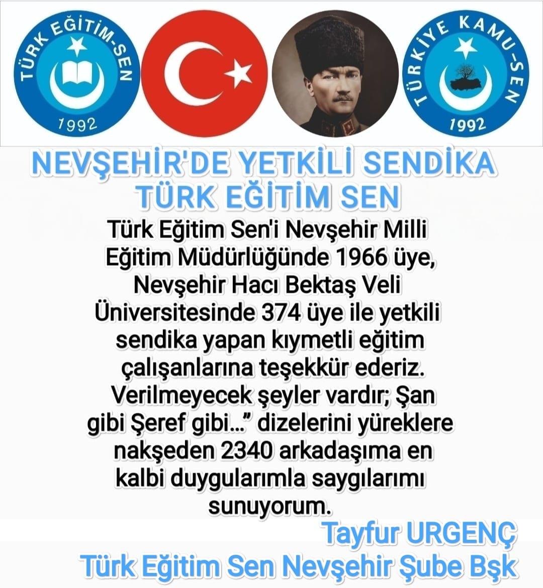 Türk Eğitim Sen Nevşehir Şube Başkanı Tayfur Urgenç yaptığı açıklamada; “Verilmeyecek şeyler vardır, şan gibi şeref gibi…” dizelerini yüreklere nakşeden 2340 ilkeli ve kararlı duruşun simgesi, cesur yürek arkadaşıma, eğitim çalışanı dostlarımıza en kalbi duygularımla saygılarımı sunarım. İsikbal değil istiklal mücadelesi olarak gördüğümüz davamızda Biz evlatlarımıza makam mevki değil mücadelemizin şerefini bırakacağız. 2340 arkadaşım hak arama mücadelesinde Elif gibi dik durmasını da bilir, vav gibi mütevazi duruşunu da ortaya koyar. Biz Türkiye sevdalıyız, Türkiye Cumhuriyeti’nin kuruluş değerleri ve kurucusu Mustafa Kemal Atatürk ile yol yürürüz. Gösterdiği hedeflere yöneliriz. Devletten başka hiçbir yapıya sadakat duymayız. Devleti ebedi müddet anlayışıyla devleti ebed adalet ilkesinin herkese uygulanmasını talep ederiz. Hak ve adalet içerisinde mücadeleye devam edeceğiz. Türk Eğitim Sen varsa eğitim çalışanı güven içerisindedir. 2340 bizim için bir sayı değil mücadele ve onurun adıdır. Dedi.