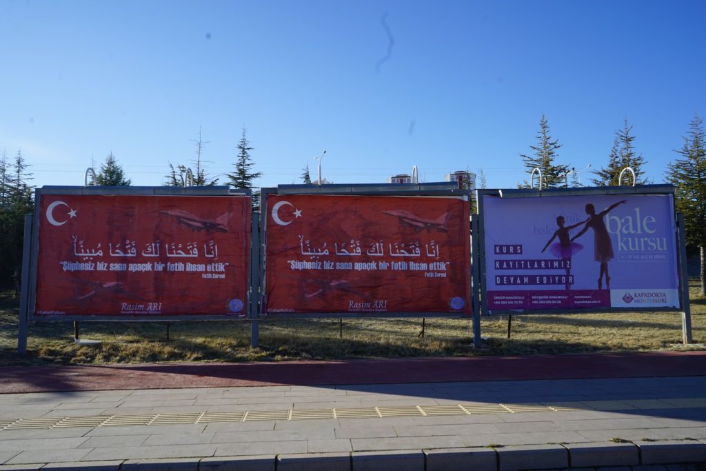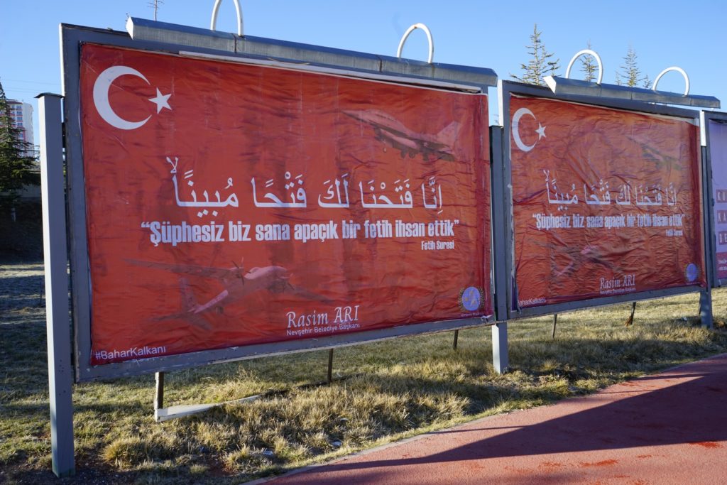 27 Şubat’ta İdlib’de rejim unsurlarının hain saldırısının ardından Türk Silahlı Kuvvetlerince (TSK) başlatılan Bahar Kalkanı Harekatı’na destek için Nevşehir Belediyesi tarafından üzerinde Fetih Suresi’nin bulunduğu afişler hazırlandı.