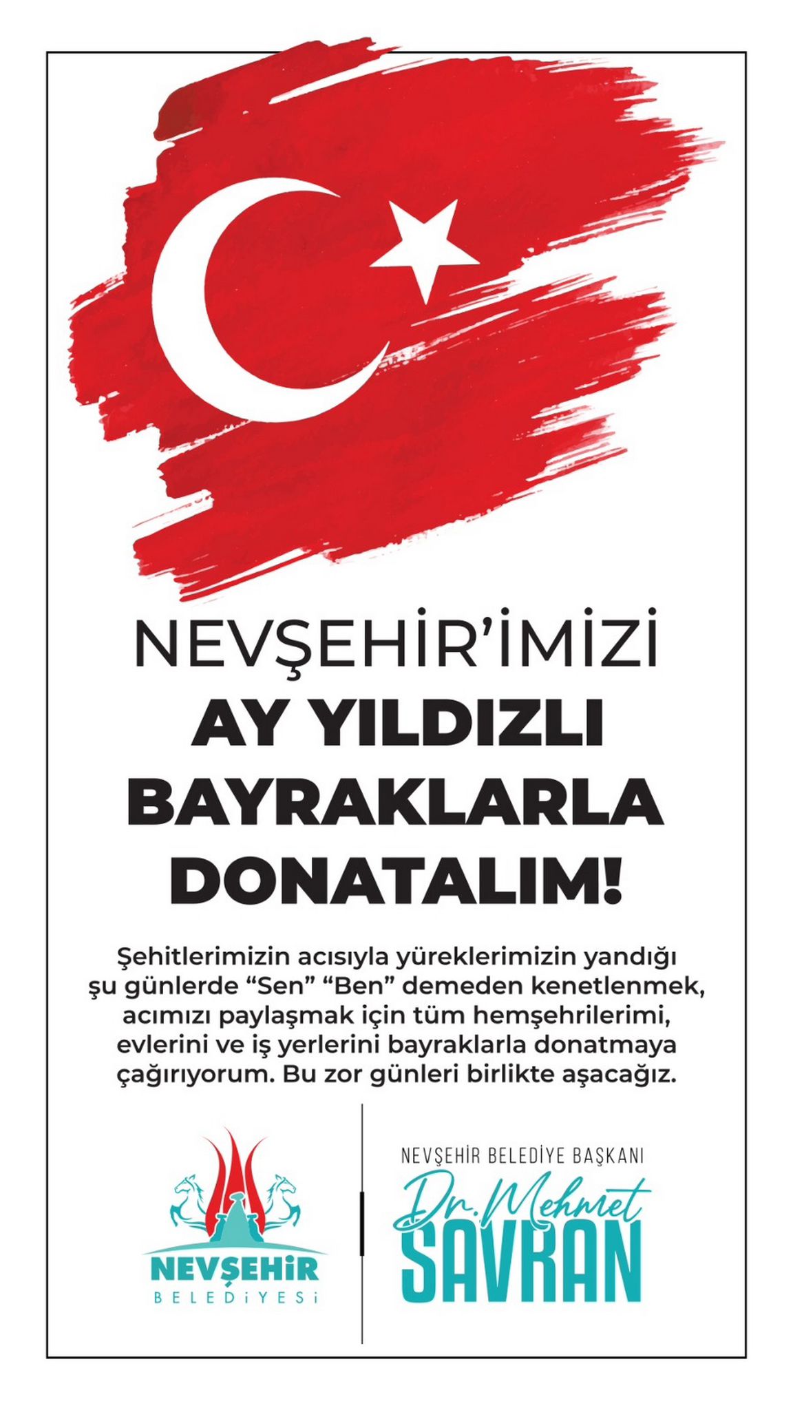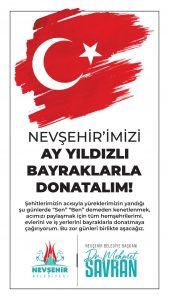 Belediye Başkanı Dr. Mehmet Savran, sosyal medya hesaplarından paylaştığı video ile Nevşehirlilere şehitler için ‘Türk bayrağı’ çağrısı yaptı. Şehitlere Allah’tan rahmet, yaralılara da acil şifa dileyen Savran, “Milletçe dayanışma içerisinde olmamız gereken günlerden geçiyoruz. Kahraman Mehmetçiğimizle ne kadar gurur duysak azdır. Alçaklarla mücadele eden kahraman askerlerimize moral vermek için, evlerimizi ve işyerlerimizi Bayrağımız ile donatalım. Evlerimize, işyerlerimize şanlı bayrağımızı asarak Mehmetçikle omuz omuza olduğumuzu ifade edelim. Bu şekilde, kahraman ordumuzun yanında olduğumuzu haykıralım. Bağımsızlığımızın sembolü al bayrağımız için yaşayan bir millet olarak; devletimize, ordumuza ve Mehmetçiğimize güç verelim.” dedi.