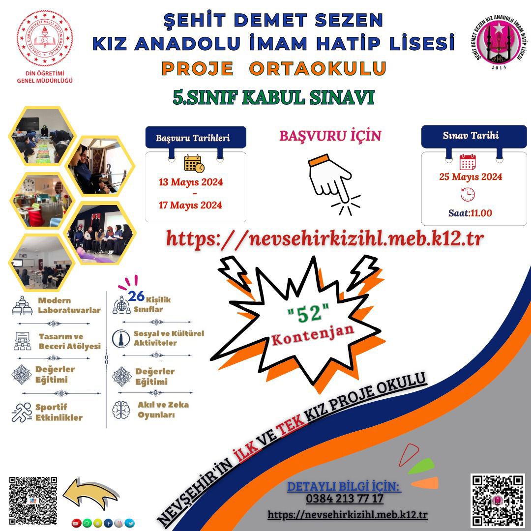 2024-2025 Eğitim Öğretim yılında Şehit Demet Sezen Kız Anadolu İmam Hatip Lisesi (Fen ve Sosyal Bilimler Proje Okulu) bünyesinde açılacak ve 26 kız öğrenciden oluşan 2 sınıfa toplam 52 kız öğrenci kabul edilecek. Müracaatlar 13-17 Mayıs 2024 tarihleri arasında alınacak olup yazılı sınav 25 Mayıs 2024 Cumartesi günü saat 11.00’de okul binasında yapılacak. Sınava il geneli ilkokulların 4.sınıfında okuyan kız öğrenciler başvuru yapabilecek olup Proje İmam Hatip Ortaokulu ile ilgili işlemler ve duyurular okulun web sayfasında bulunduğu bildirildi.