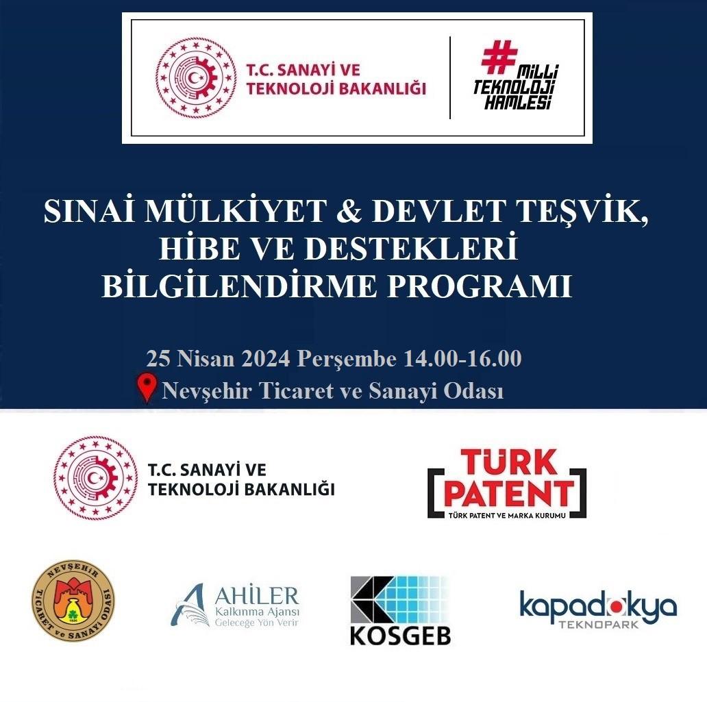 Nevşehir’de bulunan firma sahiplerine yönelik “Sınai Mülkiyet & Devlet Teşvik, Hibe ve Destekleri Bilgilendirme Programı” düzenlenecek. Nevşehir Sanayi ve Teknoloji İl Müdürü Yusuf ŞAHİN tarafından yapılan açıklamada; “Sanayi ve Teknoloji İşbirliği Kurulu Toplantısında alınan Karar gereğince (Patent Bilgi ve Dokuman Birimi sorumluları ile birlikte firmalara teşvik ve destek sağlayan ilgili kurum temsilcilerinin katılımıyla Nevşehir Ticaret ve Sanayi Odasında haftanın belirli bir günü belirli bir saat aralığında bilgi almak isteyen işletmelerin de katılımıyla sınai mülkiyet ile devlet teşvik, hibe ve destekleri vb. konularda işletmelerin bilgilendirilmelerinin sağlanması)ilimizde sınai mülkiyet verilerinin artırılması ve devlet teşvik, hibe ve desteklerinden ilimizde daha fazla firmanın yararlandırılması amacıyla;25 Nisan 2024 Perşembe günü Saat 14.00 – 16.00 arası Nevşehir Ticaret ve Sanayi Odası Toplantı Salonunda Sanayi ve Teknoloji İl Müdürlüğü, Ahiler Kalkınma Ajansı, KOSGEB İl Müdürlüğü, Nevşehir Ticaret ve Sanayi Odası ve Kapadokya Teknopark temsilcilerinin katılımıyla Sınai Mülkiyet (Patent, Marka, Faydalı Model, Tasarım, Coğrafi İşaret) Devlet Teşvik, Hibe ve Destekleri konularında firmaların bilgilendirileceğini belirtilerek, bu konularda bilgi almak isteyen ilgili tüm firma temsilcilerini bahse konu programa katılmak üzere davet ediyoruz” dedi.