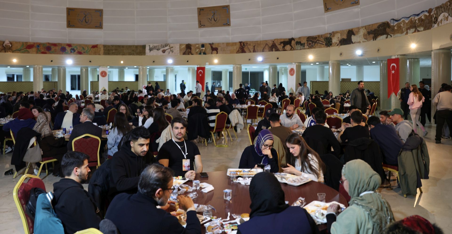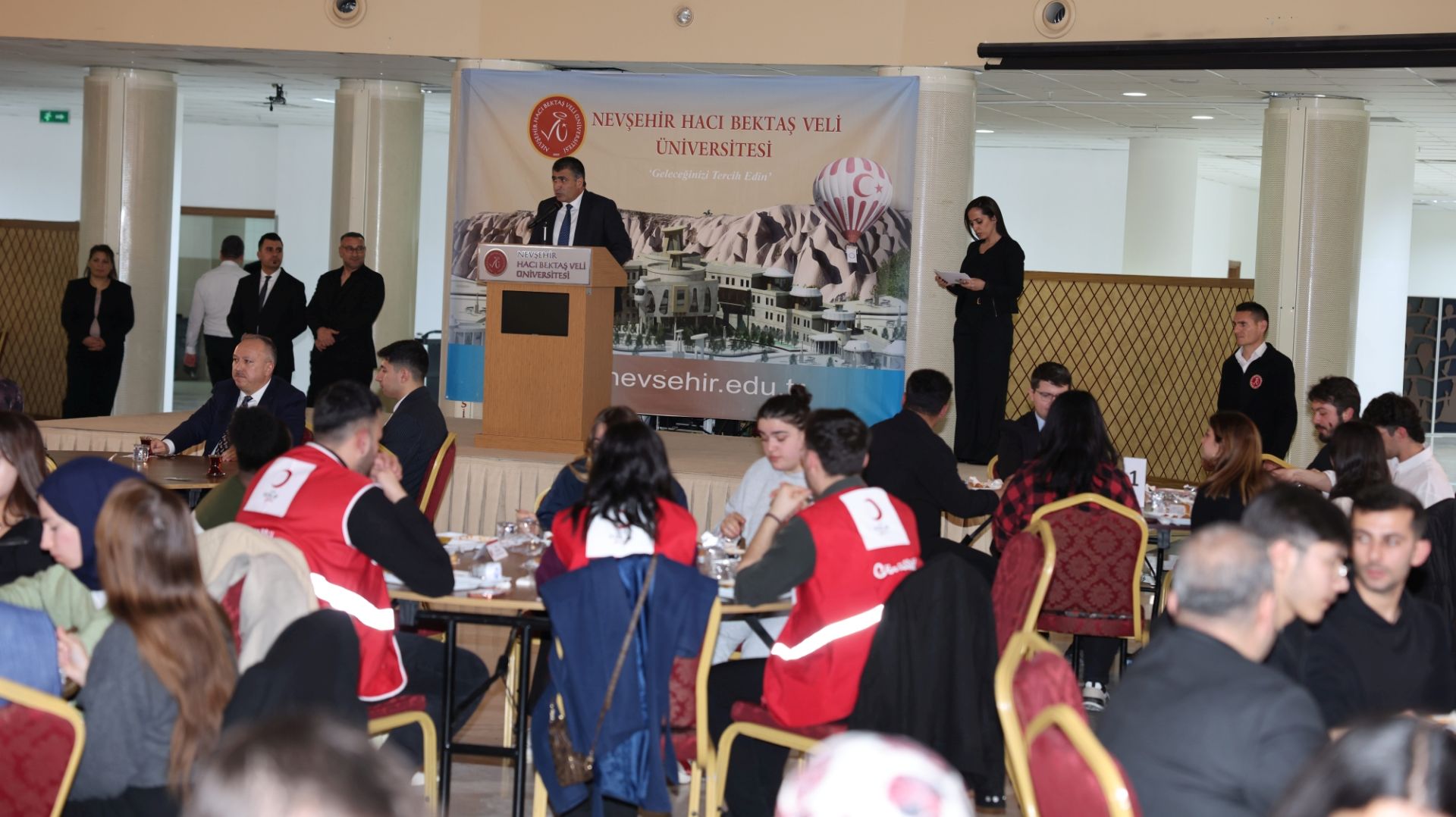 NEVÜ’nün Ramazan ayı boyunca, Nevşehir Valiliği koordinasyonunda ve Nevşehir Ticaret ve Sanayi Odası (NTSO) ile hayırseverlerin katkılarıyla gerçekleştirdiği iftar programı, üniversitenin Tafana Aşçılık ve İkram Hizmetleri Uygulama Tesisleri’nde düzenlendi. Programa; Nevşehir Valisi Ali Fidan, NEVÜ Rektörü Prof. Dr. Semih Aktekin, NTSO Başkanı M. Arif Parmaksız, Nevşehir Adalet Komisyonu Başkanı Ali İhsan Tabak, Nevşehir İl Emniyet Müdürü Serkan Karaman, Nevşehir İl Milli Eğitim Müdürü Yusuf Yazıcı, Nevşehir Gençlik ve Spor İl Müdürü Mustafa Hakan Keskin, il protokol üyeleri, hayırsever iş insanları ve çok sayıda öğrenci katıldı.