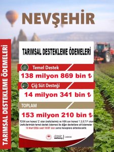 Nevşehir İl Tarım ve Orman Müdürlüğü tarafından yapılan açıklamaya göre, Nevşehir’de üreticilere toplam 153 milyon 211 bin 495 TL tarımsal destekleme ödemesi yapılacak.