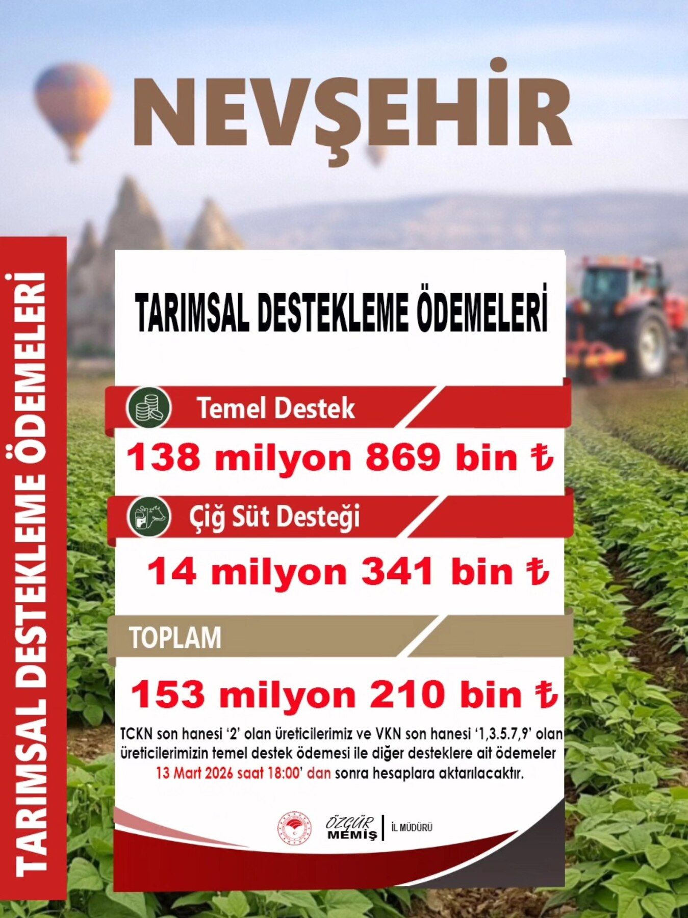 Toplam 153 milyon 211 bin 495 TL tutarındaki tarımsal destekleme ödemelerinin 13 Mart 2026 Cuma günü saat 18.00’den sonra üreticilerin hesaplarına yatırılacağı bildirildi.