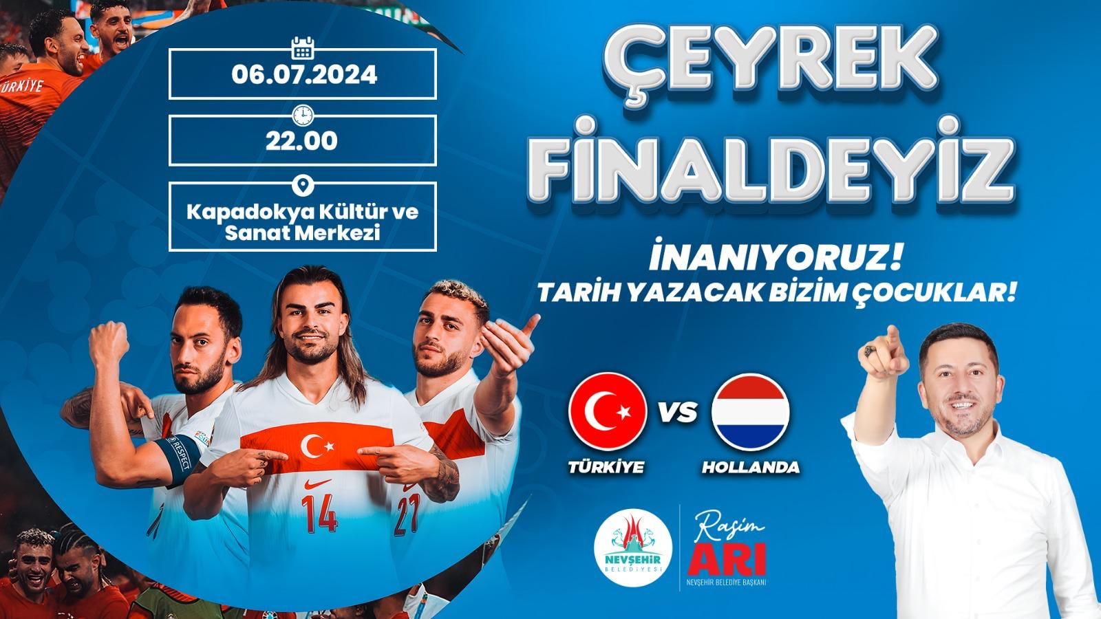 Avrupa Futbol Şampiyonası’nda çeyrek finale kalan milli takımımız, 6 Temmuz 2024 Cumartesi akşamı Hollanda karşısına çıkıyor. Nevşehir Belediyesi, bu büyük karşılaşma Kapadokya Kültür ve Sanat Merkezi bahçesine dev ekran kuruyor. Burada, milli takımımızın çeyrek final heyecanını tüm taraftarlar omuz omuza yaşayacak.