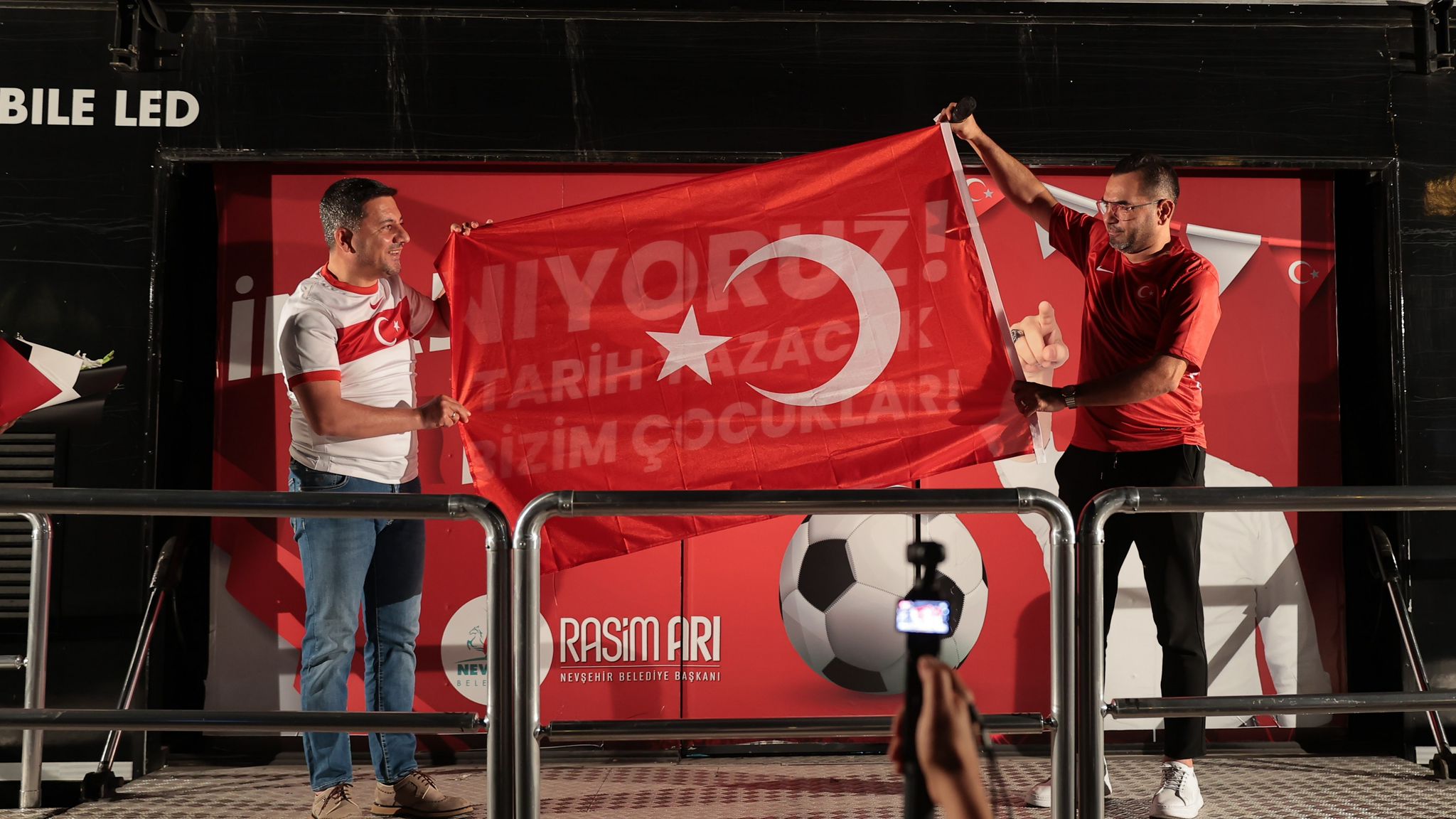 Nevşehir Belediyesi, A Milli Futbol Takımımızın EURO 2024 Avrupa Şampiyonası’ndaki maçlarını Nevşehirlilerin bir arada izleyebilmesi için Kapadokya Kültür ve Sanat Merkezi bahçesine dev ekran kurdu. Bu önemli müsabaka için maçtan saatler önce Kapadokya Kültür ve Sanat Merkezi’ne gelen vatandaşlara belediye tarafından Türk Bayrakları dağıtılarak gazoz ve patlamış mısır ikramında bulunuldu. Burada yüzlerce vatandaş, ellerinde Türk bayrakları ile A Milli Takımın mücadelesini omuz omuza izleyerek maçın heyecanını yaşadı.
