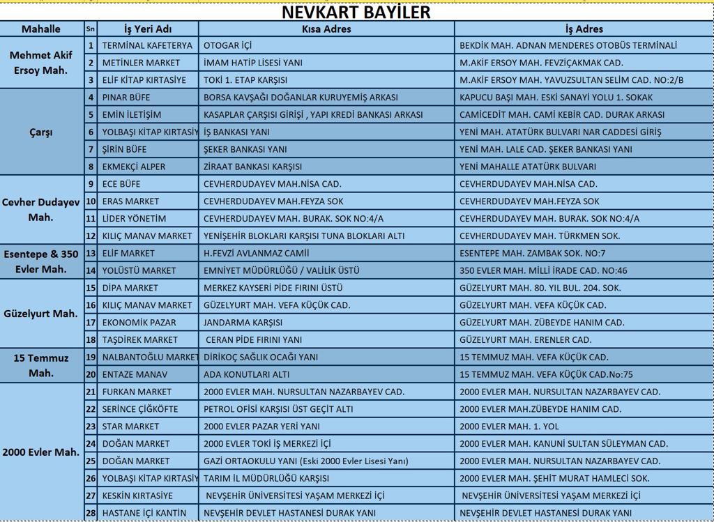 Öğrenci, 65 yaş üzeri, engelli, şehit yakınları, gazi ve gazi yakınları ise indirimli ve serbest kartlarını Atatürk Bulvarı üzerindeki Gülbahçe Parkı ve Nevşehir Hacı Bektaş Veli Üniversitesi Yaşam Merkezi (Üniversite öğrencileri) içerisinde bulunan NEVKART İşlem Merkezlerinden alabilecekler.