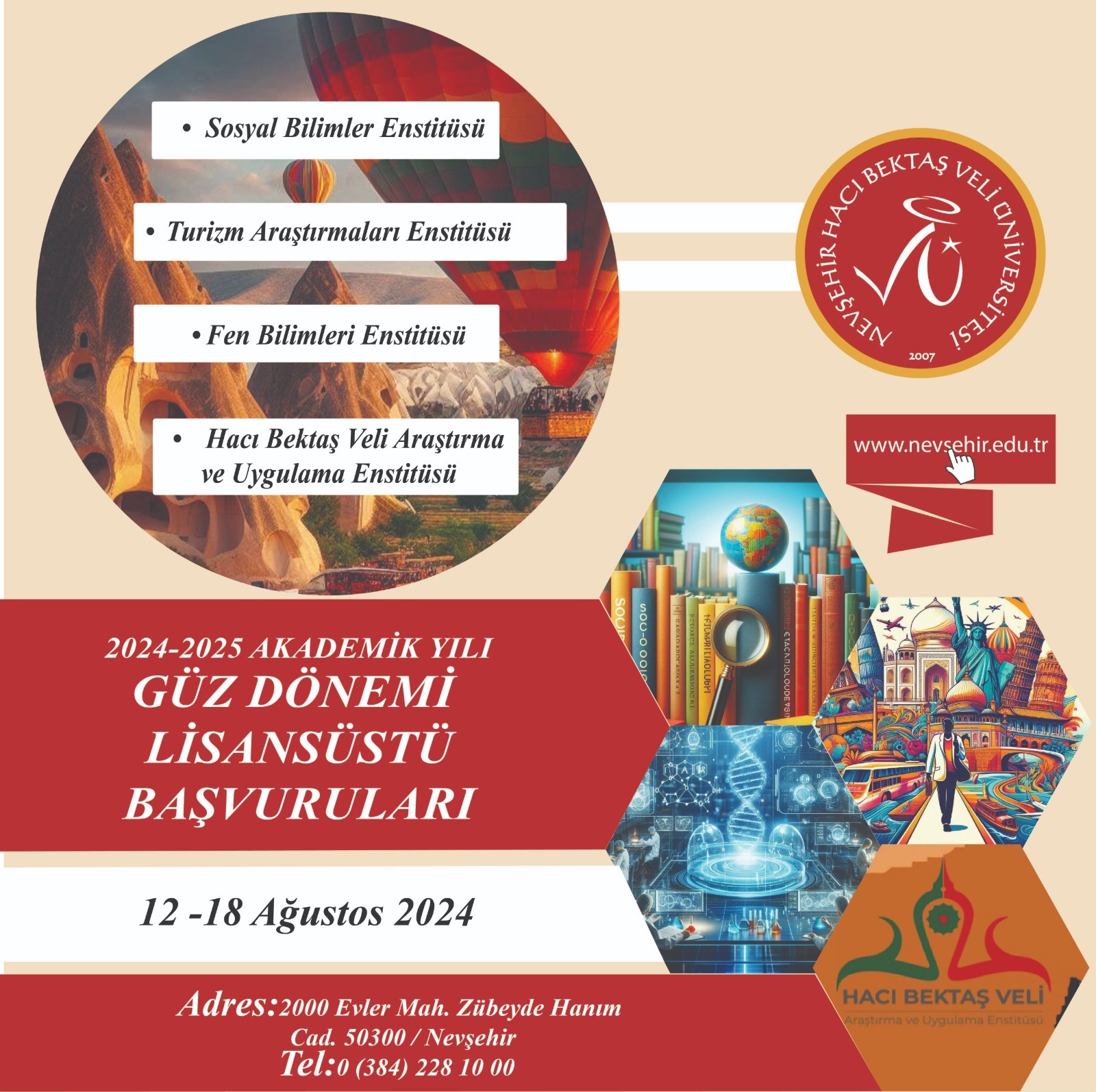 Sosyal Bilimler Enstitüsü, Turizm Araştırmaları Enstitüsü, Fen Bilimleri Enstitüsü, Hacı Bektaş Veli Araştırma ve Uygulama Enstitüsü lisansüstü programlarına (doktora, tezli yüksek lisans ve tezsiz yüksek lisans programları) ait kontenjanlar, başvuru şartları ve başvuru takvimi yayınlandı.