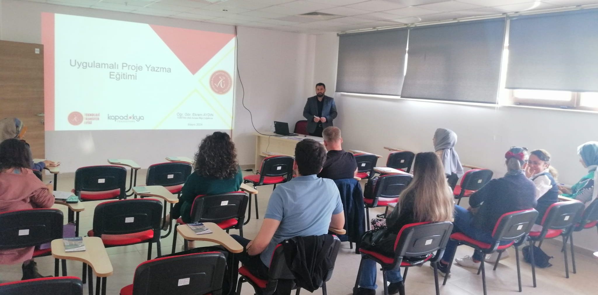 Kapadokya Teknopark’ta, Öğr. Gör. Ekrem Aydın tarafından gerçekleştirilen eğitimde; proje yazımında dikkat edilmesi gereken hususlar, TÜBİTAK tarafından desteklenmiş ve tamamlanmış proje örnekleri, TÜBİTAK Ar-Ge ve yenilik destekleri, yeşil mutabakat uyumlu öncelikli Ar-Ge ve yenilik destekleri ve Teknoloji Hazırlık Seviyesi (THS) konularında bilgi verildi.