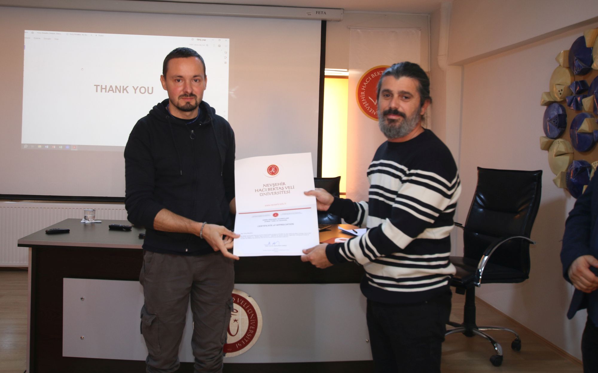 Söyleşi programı sonunda katılımlarından dolayı seramik sanatçısı Yuri Musatov’a ve çevirmen Dr. Öğr. Üyesi Ata Eskin’e teşekkür belgelerini Avanos Güzel Sanatlar MYO Müdürü Öğr. Gör. Bahadır Cem Erdem ile birlikte takdim eden ASEM Müdürü Doç. Dr. Betül Aytepe Serinsu, ‘Seramik Söyleşileri’ kapsamında ulusal ve uluslararası konukları ağırlamaya devam edeceklerini söyledi.