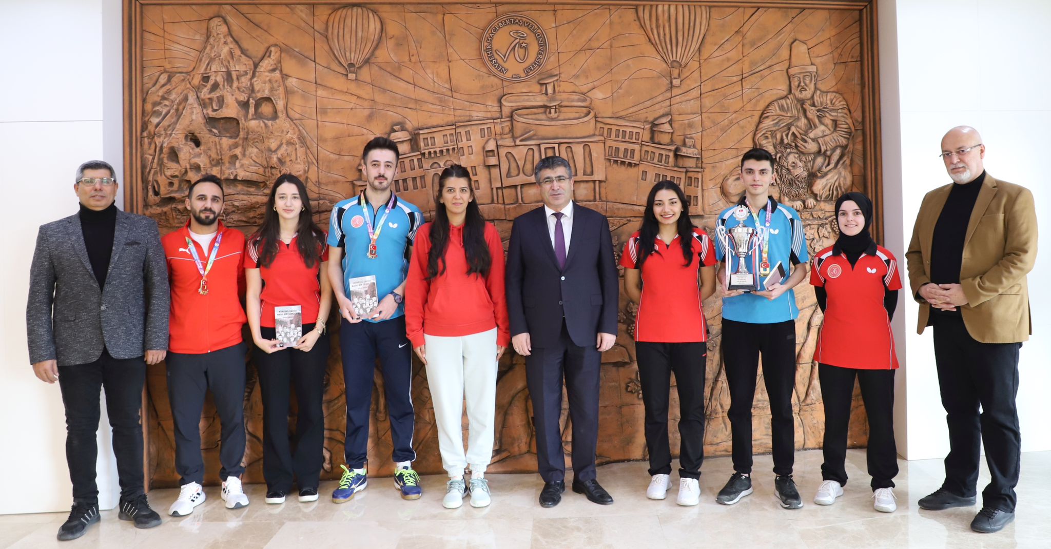 Türkiye Üniversite Sporları Federasyonu (TÜSF) tarafından düzenlenen Masa Tenisi Türkiye Şampiyonası 1. Lig Masa Tenisi Müsabakaları’nda şampiyon olan NEVÜ Erkek Takımı ve dördüncü olan Bayan Takımı, NEVÜ Rektörü Prof. Dr. Semih Aktekin’i ziyaret etti.