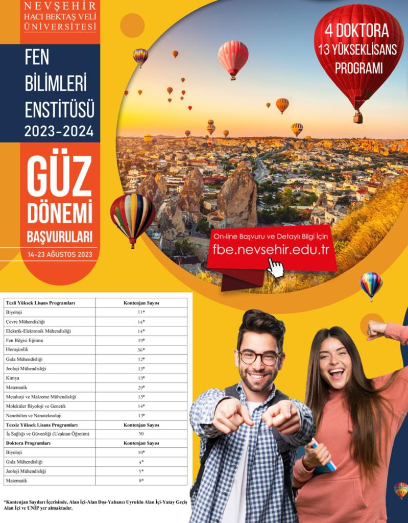 Nevşehir Hacı Bektaş Veli Üniversitesi (NEVÜ) Fen Bilimleri Enstitüsü, 2023-2024 Eğitim – Öğretim Yılı Güz Yarıyılı için 201’i tezli yüksek lisans programlarına, 50’si tezsiz yüksek lisans programlarına ve 27’si de doktora programlarına olmak üzere toplam 278 öğrenci alacak.