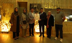 Daha sonra Öğr. Gör. Dr. Kamber Koç atölyesi öğrencilerinin yıl boyunca ortaya koydukları özgün çalışmalarından oluşan serginin açılışını katılımcılarla birlikte gerçekleştiren Rektör Aktekin, sergi alanını gezerek öğrencilerden eserleri hakkında bilgi aldı.