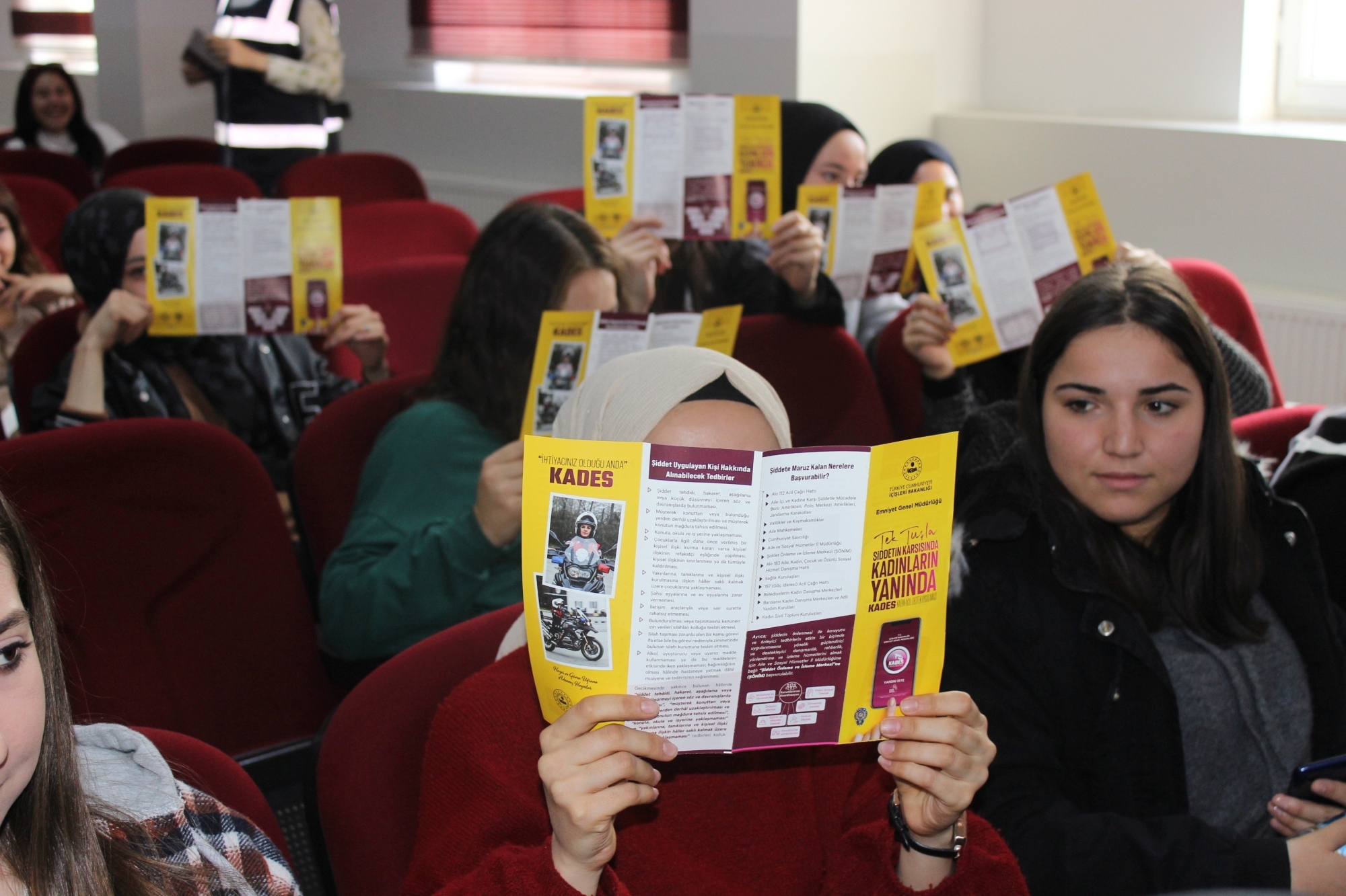 NEVÜ Gülşehir SBMYO Konferans Salonunda gerçekleştirilen etkinlikte Gülşehir İlçe Emniyet Müdürlüğünde görevli ekipler tarafından kadına şiddet olaylarının önüne geçebilmek ve kadınlara yardım edebilmek amacıyla geliştirilen KADES uygulaması hakkında öğrencilere, detaylı bilgiler verildi. Ayrıca öğrencilerin olası acil bir durumda kendilerini nasıl koruyacaklarını ve uygulamayı nasıl kullanacaklarını göstermek amacıyla KADES uygulaması hakkında broşürler dağıtıldı. KADES uygulaması hakkında bilgilendirilen öğrenciler KADES uygulamasını telefonlarına indirerek olası bir şiddet eylemine karşı hazır hale geldiler.