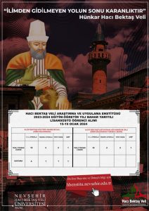 NEVÜ Hacı Bektaş Veli Araştırma ve Uygulama Enstitüsü 2023- 2024 Eğitim-Öğretim Yılı Bahar Yarıyılı için; Alevi Bektaşi Kültürü Anabilim Dalı (Disiplinlerarası) tezli yüksek lisans programına 15, doktora programına 7 ve Alevi Bektaşi İlmi Kaynakları Anabilim Dalı (Disiplinlerarası) tezli yüksek lisans programına da 15 olmak üzere toplam 37 öğrenci alacak.
