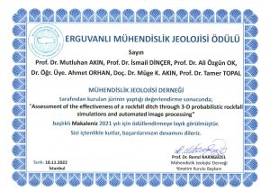 Mühendislik Jeolojisi Derneği (MJD) tarafından 2014 yılından itibaren her yıl verilen “Kemal Erguvanlı Mühendislik Jeolojisi Ödülleri” kapsamında “Uluslararası Makale” kategorisinde Nevşehir Hacı Bektaş Veli Üniversitesi Mühendislik Mimarlık Fakültesi Jeoloji Mühendisliği Bölümü ve NEVÜ Kapadokya Jeolojik Miras ve Kaya Oyma Yapıları Uygulama ve Araştırma Merkezi öğretim üyeleri Prof. Dr. Mutluhan Akın, Prof. Dr. İsmail Dinçer ve Dr. Öğr. Üyesi Ahmet Orhan’ın da aralarında bulunduğu ekip tarafından Q1 sınıfındaki “Engineering Geology” isimli uluslararası dergide 2021 yılında yayınlanan “Akin, M., Dinçer, İ., Ok, A.Ö., Orhan, A., Akin, M.K., Topal, T., 2021. Assessment of the effectiveness of a rockfall ditch through 3-D probabilistic rockfall simulations and automated image processing, Engineering Geology 283, 106001, 1-17” künyeli makaleleri en iyi uluslararası makale ödülüne layık görüldü.