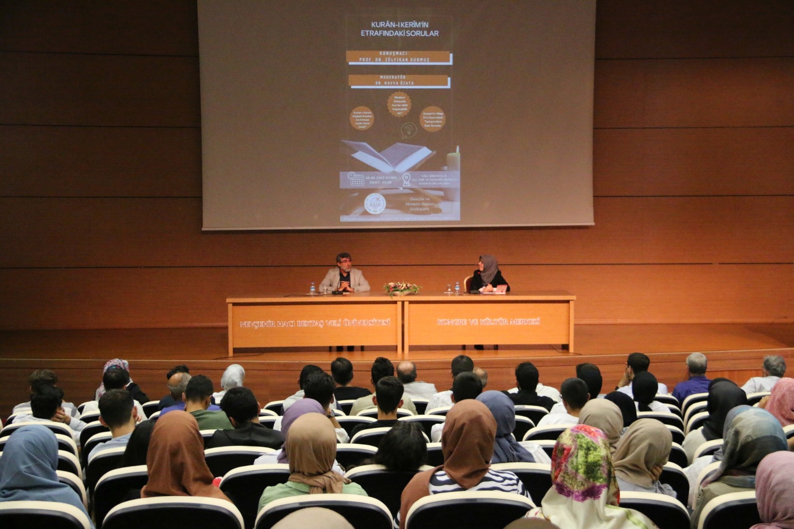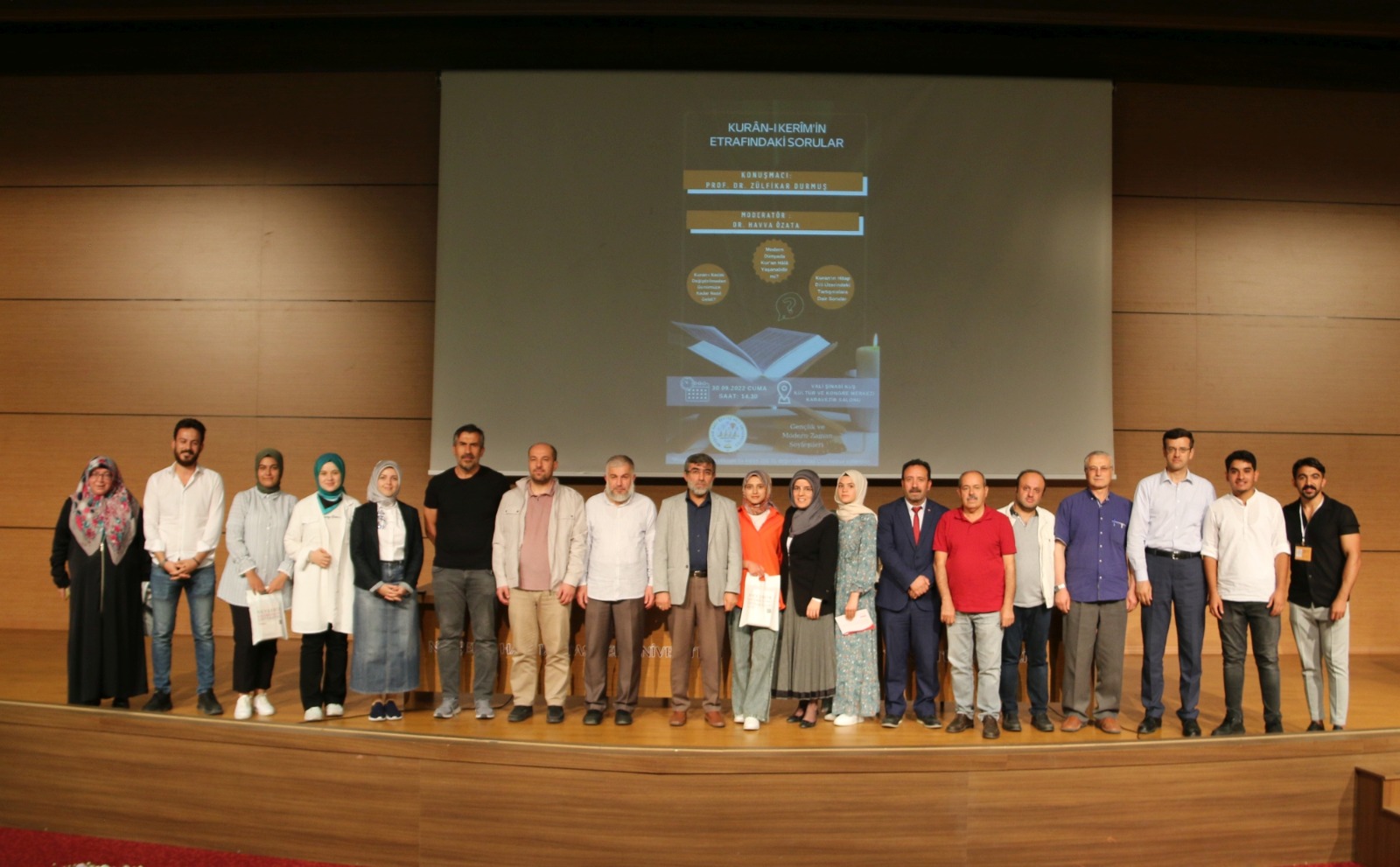 Vali Şinasi Kuş Kültür ve Kongre Merkezi Karavezir Salonu’nda düzenlenen ve moderatörlüğünü Temel İslam Bilimleri Tefsir Anabilim Dalı Dr. Havva Özata’nın yaptığı söyleşide Dekan Prof. Dr. Zülfikar Durmuş “Kur’ân-ı Kerîm’in Etrafındaki Sorular” üzerine konuştu.