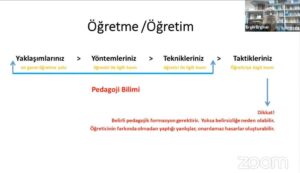 Nevşehir Hacı Bektaş Veli Üniversitesi (NEVÜ) öğretim üyesi Doç. Dr. Ergin Erginer, bir dersin bilişsel, duyuşsal ve psikomotor bileşenlerini anlattıktan sonra katılımcılar ile örnek ders planları incelemesi yaparak katılımcılardan gelen soruları cevapladı.