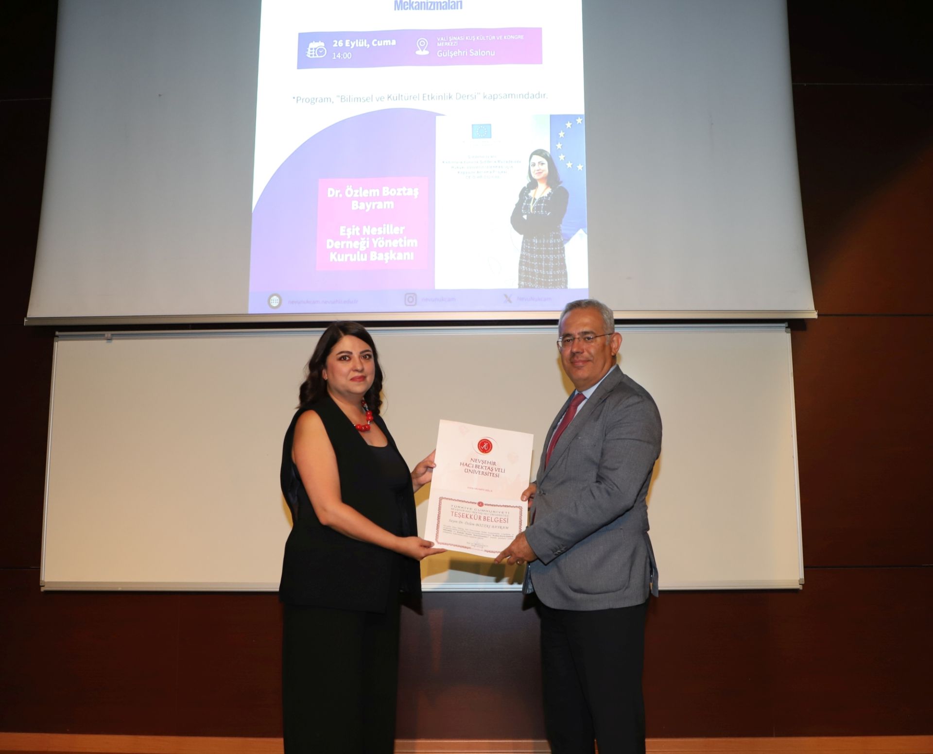 Vali Şinasi Kuş Kültür ve Kongre Merkezi’nde gerçekleştirilen seminere, NEVÜ Rektör Yardımcısı Prof. Dr. Mutluhan Akın, NÜKÇAM Yönetim Kurulu üyeleri, akademisyenler ve öğrenciler katılım gösterdi.