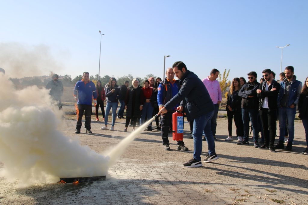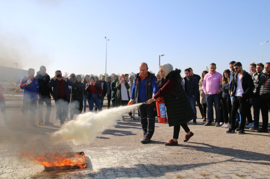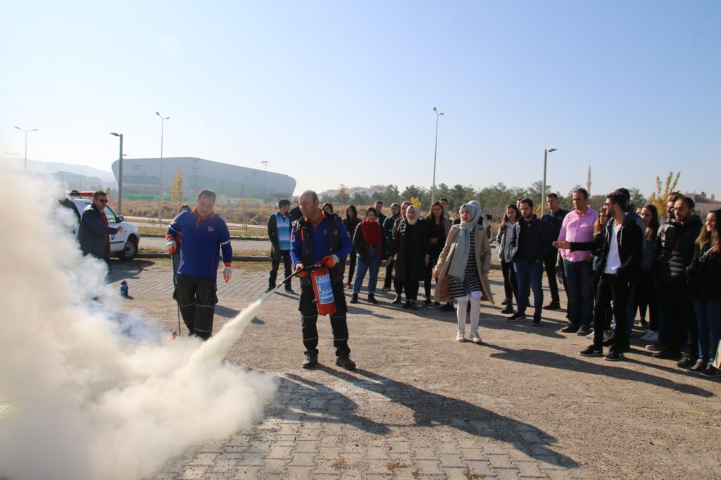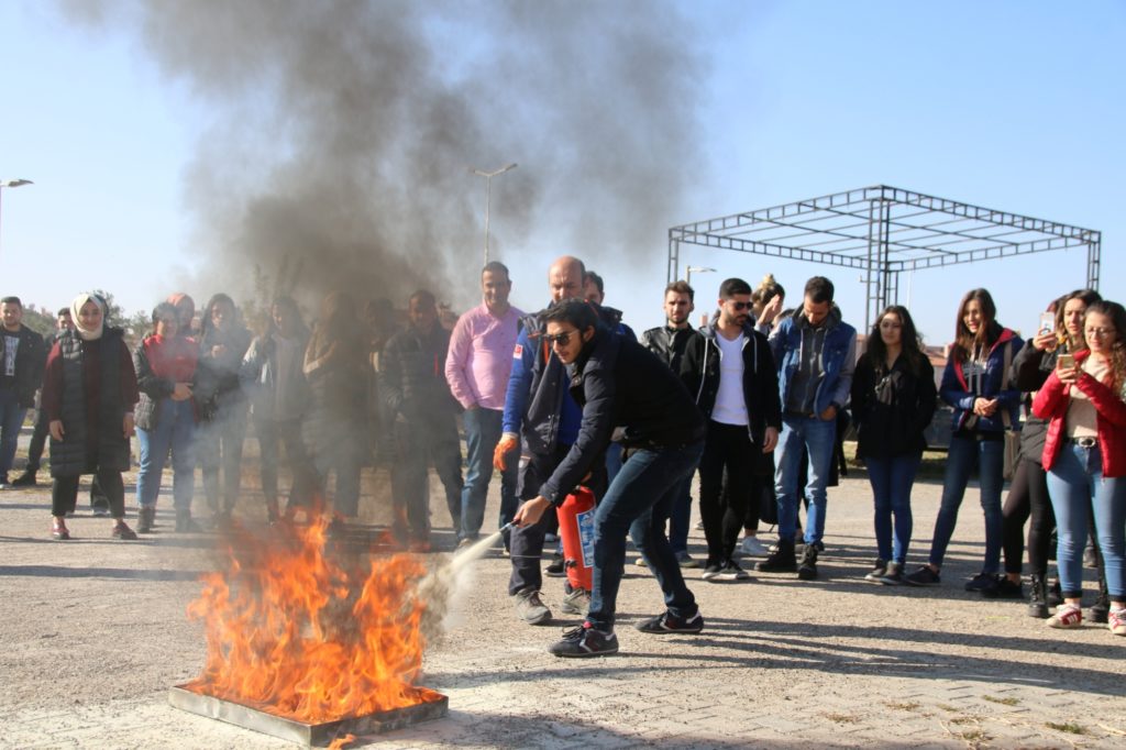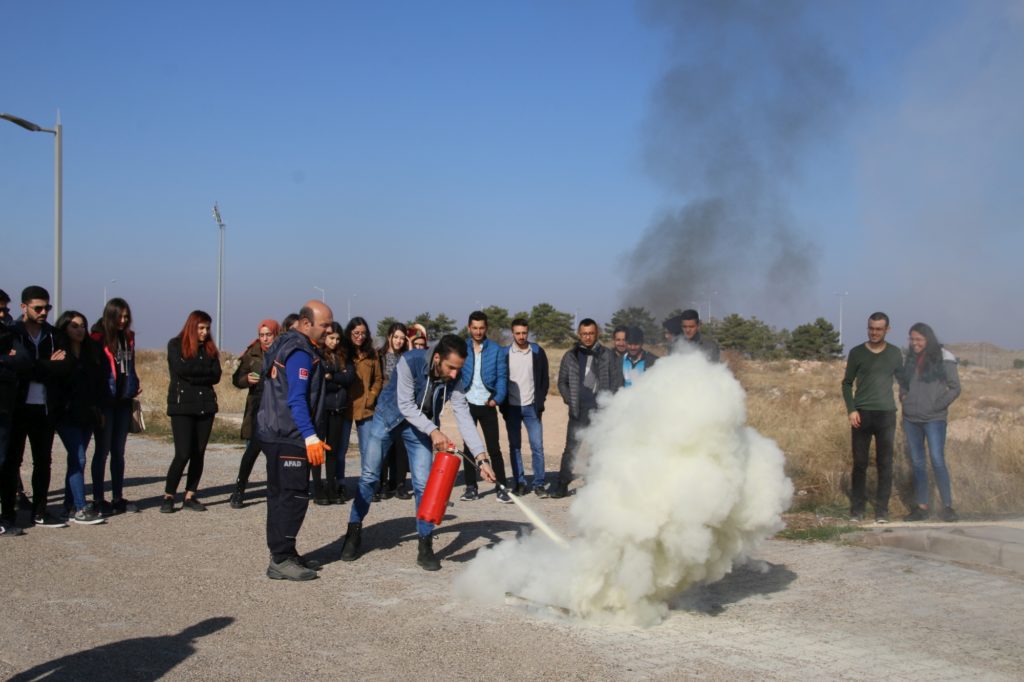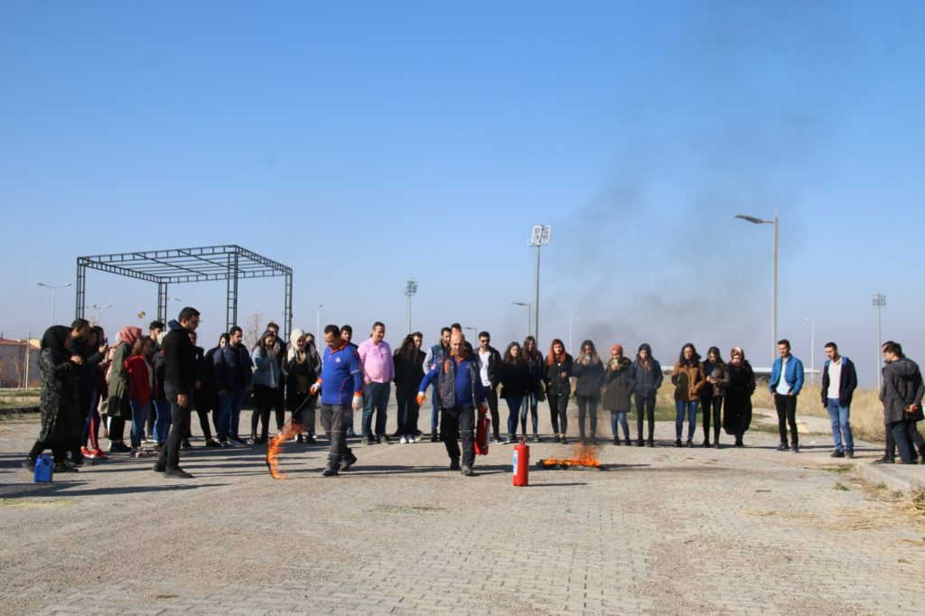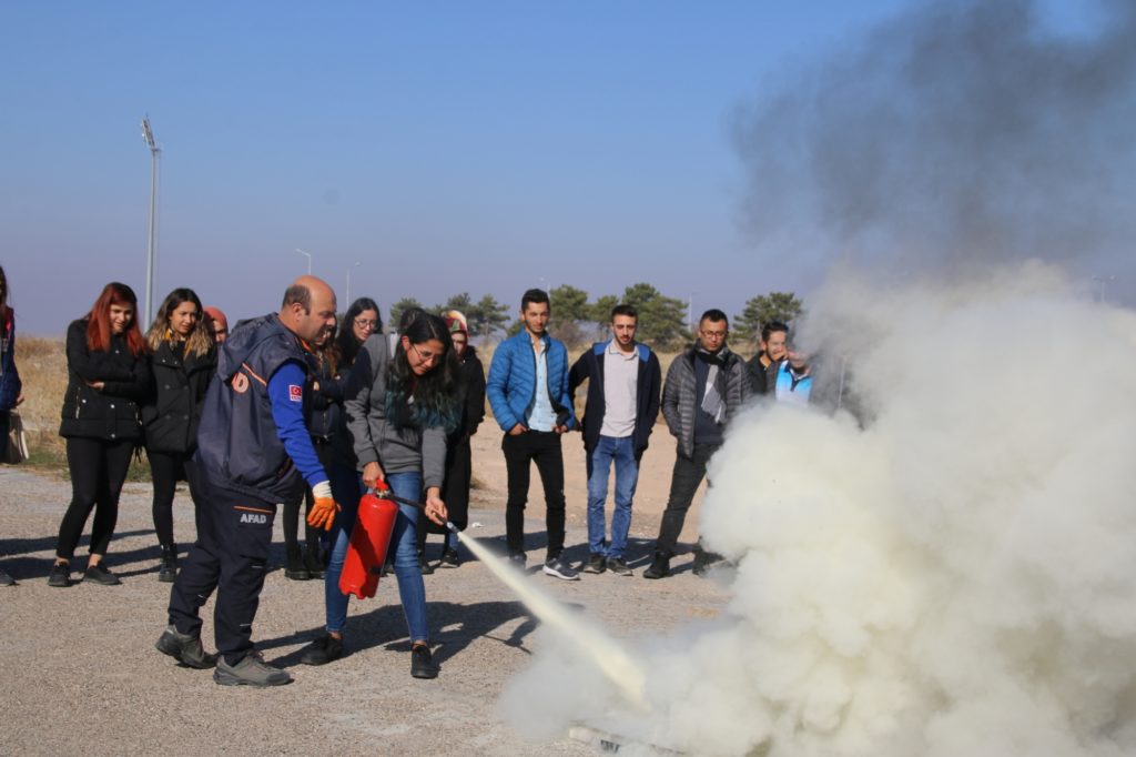 AFAD personeli yangınlarla ilgili öğrencilere teorik bilgiler aktardıktan sonra,  üniversitenin kampüs alanında ateş yakılarak yangın söndürücü tüplerinin kullanımı ve yangına müdahale konularında öğrencilere uygulamalar yaptırıldı.