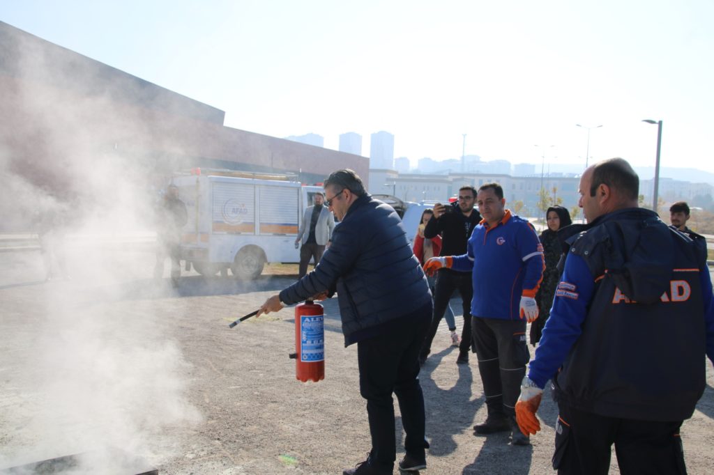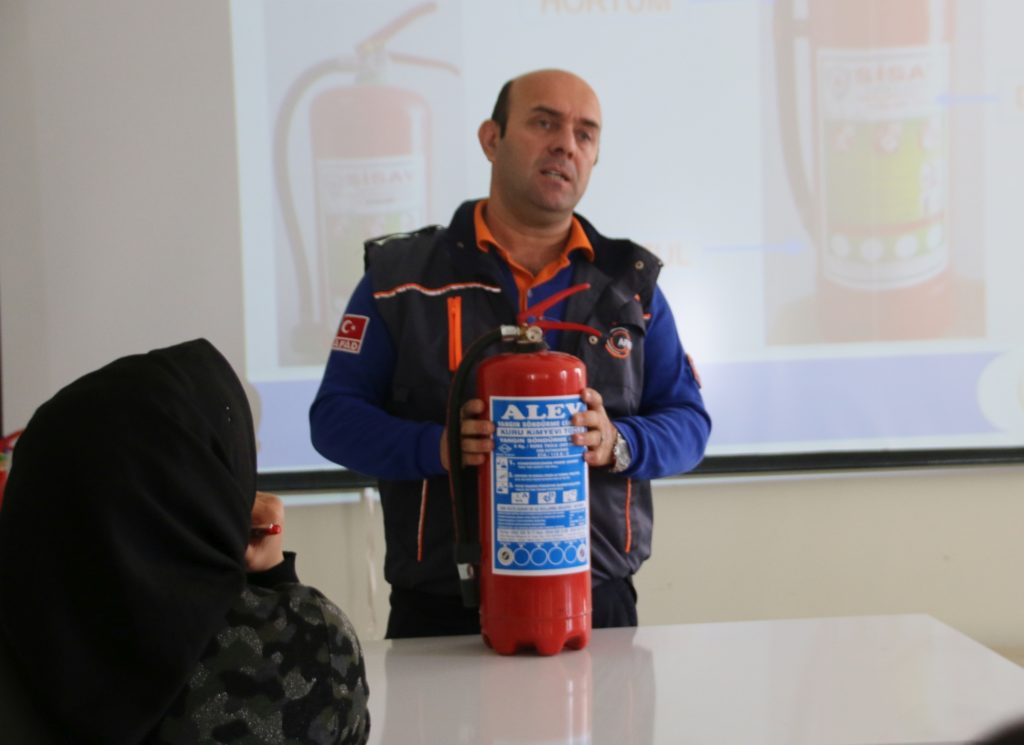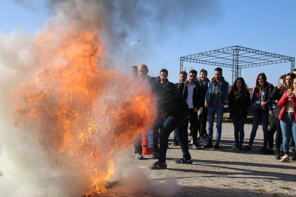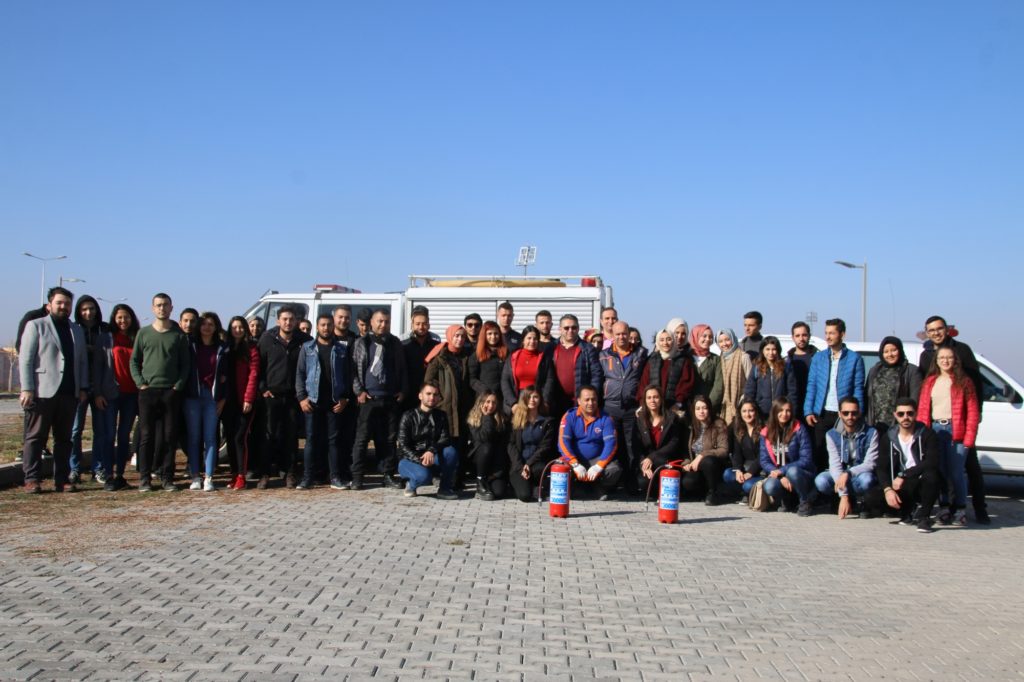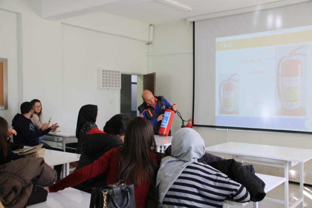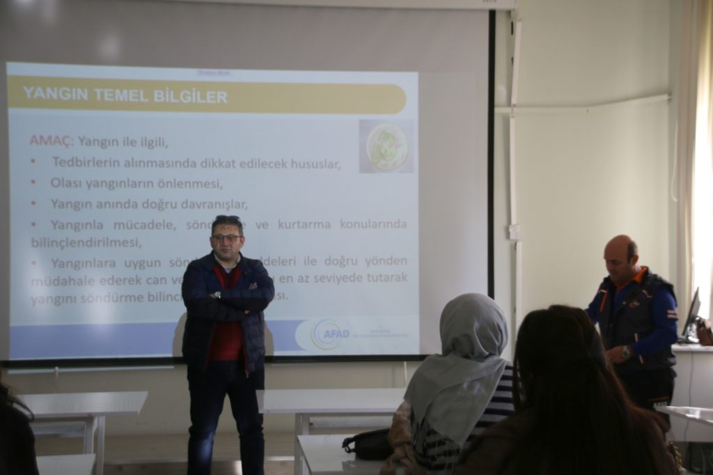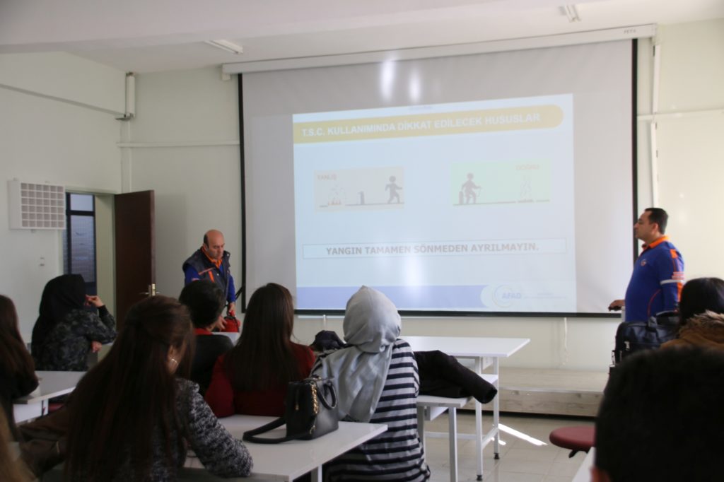 AFAD personeli yangınlarla ilgili öğrencilere teorik bilgiler aktardıktan sonra,  üniversitenin kampüs alanında ateş yakılarak yangın söndürücü tüplerinin kullanımı ve yangına müdahale konularında öğrencilere uygulamalar yaptırıldı.