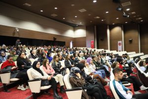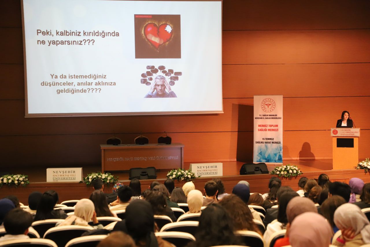 Nevşehir İl Sağlık Müdürlüğü ve NEVÜ iş birliği ile Vali Şinasi Kuş Kültür ve Kongre Merkezi Karavezir Salonu’nda düzenlenen programda; “Kendime İyi Bak” başlıklı sunumda bulunan Nevşehir İl Sağlık Müdürlüğü Merkez Toplum Sağlığı Merkezi 15 Temmuz Sağlıklı Hayat Merkezi Psikososyal Destek Birimi Psikoloğu Gülşen Çelik; Ruhsal olarak sağlıklı olmak nedir?, İnsan olarak neler tecrübe ederiz?, Yaptıklarımız bizi nereye götürür? ve Anlamlı bir yaşam için neler yapabiliriz? Konuların da öğrencileri bilgilendirdi. Söyleşi programına; İl Sağlık Müdürlüğü Psikologları Murat Arslan, Samet Can Çiriş, Tuba Kabukcu Doğan, Rumaysa Aydın Kızılaslan, Sosyal Çalışmacı Ayşe Kabak da katıldı.