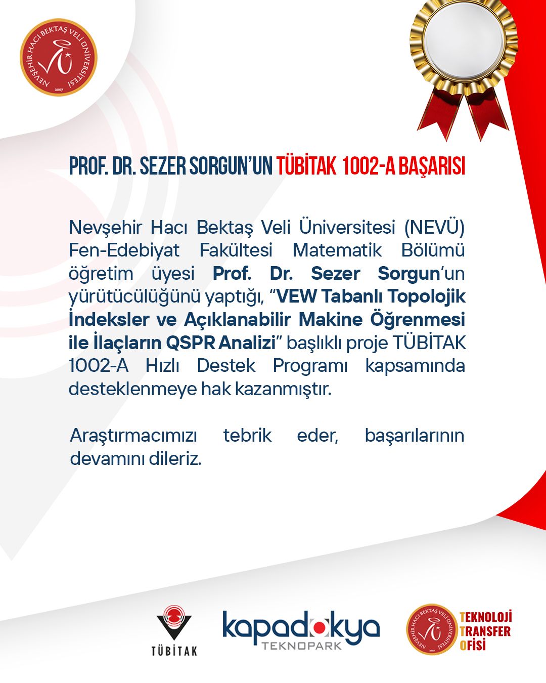 Nevşehir Hacı Bektaş Veli Üniversitesi (NEVÜ) Fen-Edebiyat Fakültesi Matematik Bölümü öğretim üyesi Prof. Dr. Sezer Sorgun’un yürütücülüğünü üstlendiği “VEW Tabanlı Topolojik İndeksler ve Açıklanabilir Makine Öğrenmesi ile İlaçların QSPR Analizi” başlıklı proje, TÜBİTAK’ın “1002-A Hızlı Destek Programı” kapsamında destek almaya hak kazandı.