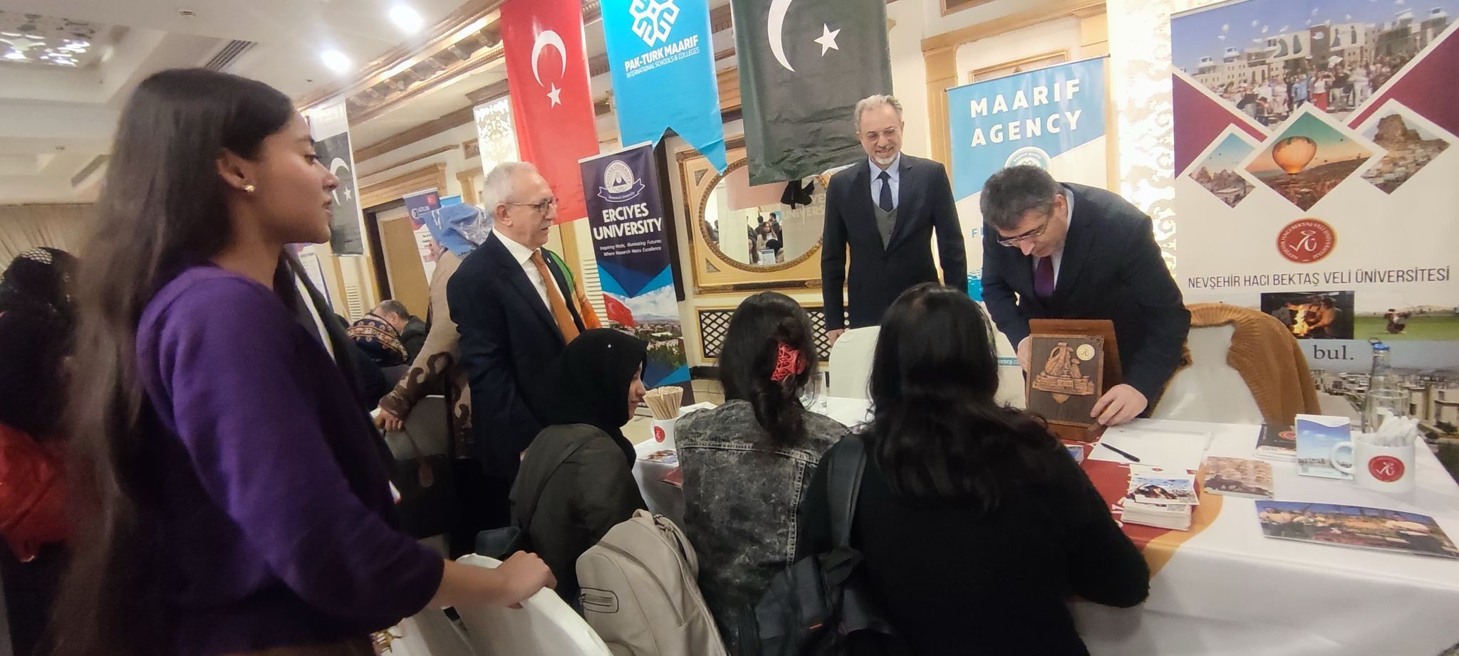 Türkiye Maarif Vakfı (TMV) bünyesindeki Maarif Ajansı Pakistan Direktörlüğü tarafından organize edilen eğitim fuarına, NEVÜ Rektörü Prof. Dr. Semih Aktekin, Türkiye İslamabad Büyükelçisi Mehmet Paçacı, Lahor Başkonsolosu Durmuş Baştuğ, Erciyes Üniversitesi Rektörü Prof. Dr. Fatih Altun, Selçuk Üniversitesi Rektörü Prof. Dr. Metin Aksoy, Hakkari Üniversitesi Rektörü Prof. Dr. Ömer Pakiş, Türk Alman Üniversitesi Rektörü Prof. Dr. Cemal Yıldız, TMV Mütevelli Heyeti Başkan Vekili Prof. Dr. Ahmet Emre Bilgili, NEVÜ Uluslararası İlişkiler Ofisi uzmanı Öğr. Gör. Şükrü Aydın, üniversite rektörleri, akademisyenler, öğrenciler katıldı.