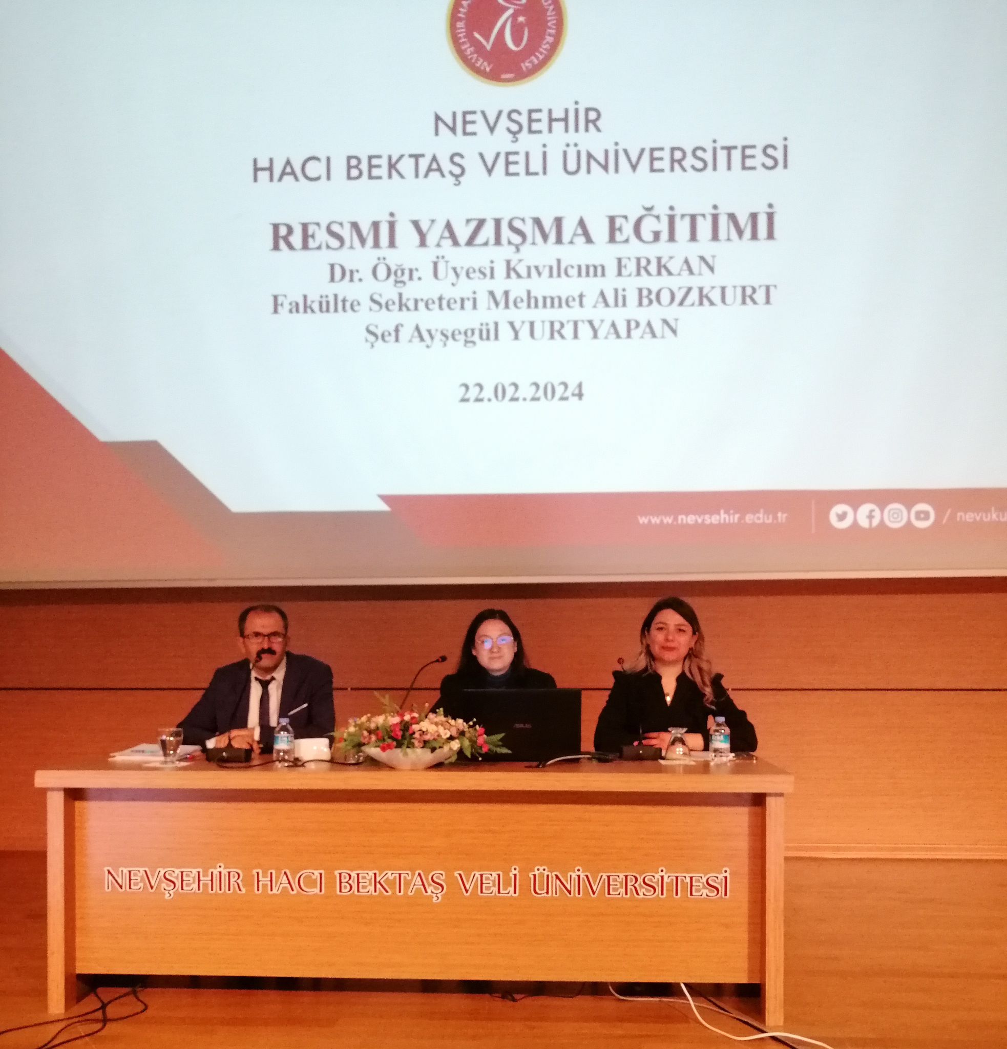 T.C. Cumhurbaşkanlığı Bilgi ve Belge Yönetimi Daire Başkanlığı tarafından resmi yazışma süreçlerinde uygulama birliğinin sağlanması, kamu kurum ve kuruluşlarında ihtiyaç halinde resmi yazışma süreçlerine ilişkin eğitim ve “Resmi Yazışma Eğiticilerinin Eğitimi” kapsamında NEVÜ’nün Fakülte, Enstitü ve Yüksekokul sekreterleri ile Rektörlüğe bağlı ilgili birimlerde görev yapan idari personele yönelik “Resmi Yazışma Eğitimi” verildi.