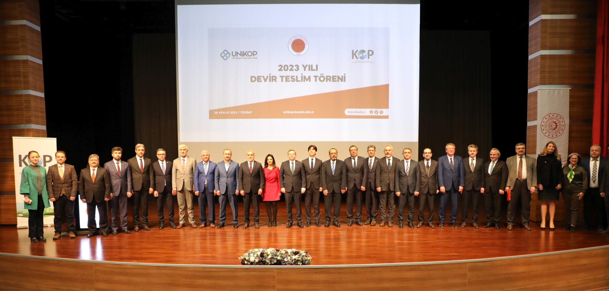 Yozgat Bozok Üniversitesi Erdoğan Akdağ Kongre ve Kültür Merkezi’nde gerçekleştirilen UNİKOP Dönem Başkanlığı devir teslim törenine; Yozgat Valisi Ziya Polat, Yozgat Belediye Başkanı Celal Köse, Konya Ovası Projesi Bölge Kalkınma İdaresi Başkanı Murat Karakoyunlu, UNİKOP 2022 Yılı Dönem Başkanı Konya Teknik Üniversitesi Rektörü Osman Nuri Çelik, Yozgat Bozok Üniversitesi Rektörü Prof. Dr. Ahmet Karadağ, Selçuk Üniversitesi Rektörü Prof. Dr. Metin Aksoy, Kırıkkale Üniversitesi Rektörü Prof. Dr. Ersan Aslan,