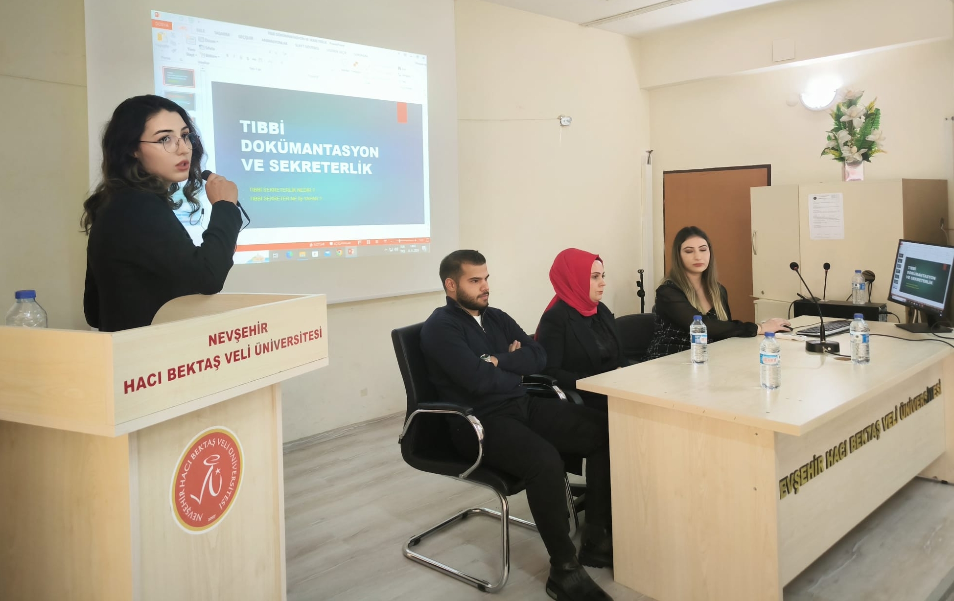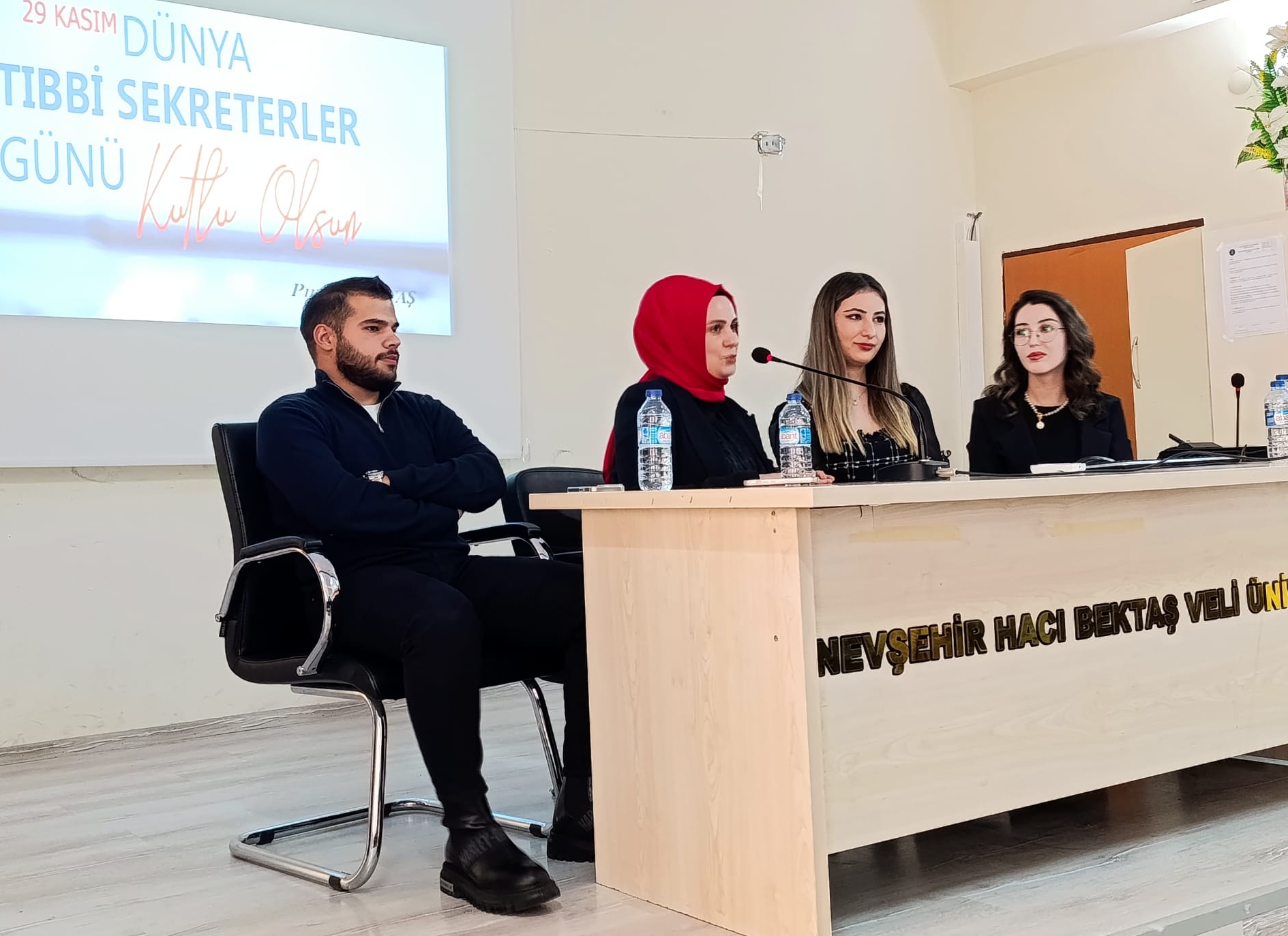 Etkinliğe konuşmacı olarak katılan Nevşehir Devlet Hastanesi’nde Tıbbi Sekreterleri Pınar Tuztaş, Hüseyin Sevin, Sedanur Kuzugüden ve Tuğba İşbeceren tıbbi sekreter olarak çalışmanın kolay ve zor yönleri, özlük hakları, iş bulma olanakları görev aldığı birimler, yükselme olanakları, okul eğitimin dışında olması gereken temel bilgi ve beceriler, sertifika programları, hastanelerde çalışma koşulları, mesleki eğitim süreçleri ve mesleki deneyimleri arasındaki ilişki, aldıkları eğitimin mesleki becerilerine yansıması gibi konular üzerine konuştu.