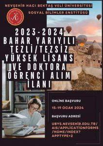 Nevşehir Hacı Bektaş Veli Üniversitesi (NEVÜ) Sosyal Bilimleri Enstitüsü, 2023-2024 Eğitim – Öğretim Yılı Bahar Yarıyılı için 358’i tezli yüksek lisans programlarına, 360’ı tezsiz yüksek lisans programlarına ve 85’i de doktora programlarına olmak üzere toplam 803 öğrenci alacak.
