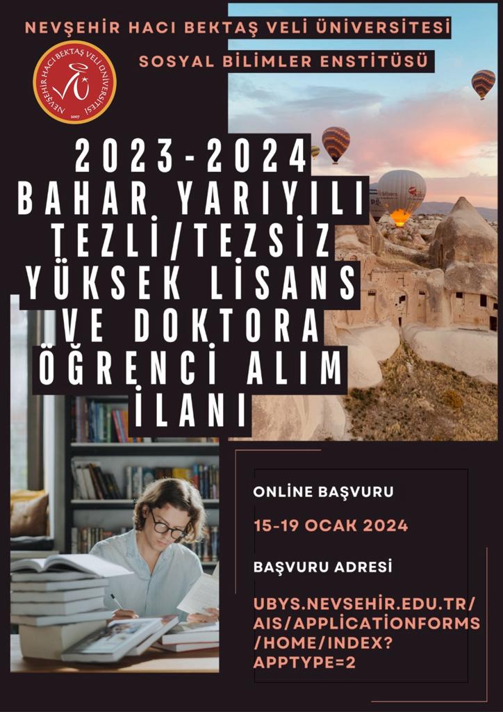 Sosyal Bilimleri Enstitüsü ilanında belirtilen tezli/tezsiz yüksek lisans ve doktora programları için öğrencilerin başvuruları https://ubys.nevsehir.edu.tr/AIS/ApplicationForms/Home/Index?apptype=2 adresi üzerinden çevrimiçi (online) olarak 15-19 Ocak 2024 tarihleri arasında alınacak.