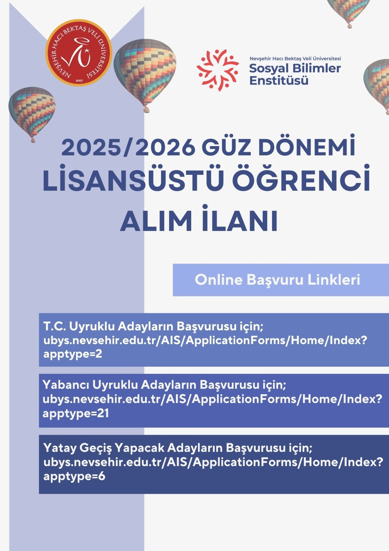 NEVÜ Sosyal Bilimleri Enstitüsü 2025- 2026 Eğitim-Öğretim Öğretim Yılı Güz Yarıyılı için; Arkeoloji Anabilim Dalı tezli yüksek lisans programına 13, Bankacılık ve Finans Anabilim Dalı tezli yüksek programına 23, Beden Eğitimi ve Spor Anabilim Dalı tezli yüksek lisans programına 13, Coğrafya Anabilim Dalı tezli yüksek lisans programına 14, Çağdaş Türk Lehçeleri ve Edebiyatları Anabilim Dalı tezli yüksek lisans programına 15, Dış Ticaret Anabilim Dalı tezsiz yüksek lisans programına (ikinci öğretim) 60, Ekonomi ve Finans Anabilim Dalı tezsiz yüksek lisans programına (ikinci öğretim) 40, Eğitim Programları ve Öğretim Anabilim Dalı tezli yüksek lisans programına 20, Görsel İletişim Tasarımı Anabilim Dalı tezli yüksek lisans programına 16, Güzel Sanatlar Eğitimi Anabilim Dalı Müzik Eğitimi tezli yüksek lisans programına 9, İktisat Anabilim Dalı tezli yüksek lisans programına 20, doktora programına 8, İşletme Anabilim Dalı tezli yüksek lisans programına 23, tezsiz yüksek lisans programına (ikinci öğretim) 40, İşletme doktora programına 9, Üretim Yönetimi ve Pazarlama Bilim Dalı doktora programına 6, Yönetim ve Organizasyon tezli yüksek lisans programına 18, Yönetim ve Organizasyon doktora programına 7, Kamu Politikası ve İşletmeciliği Anabilim Dalı tezli yüksek lisans programına 14 ve tezsiz yüksek lisans programına (ikinci öğretim) 35, Kamu Yönetimi Anabilim Dalı tezli yüksek lisans programına 24, Kültürel Miras ve Kültür Yönetimi Anabilim Dalı tezli yüksek lisans programına 14, Sağlık Yönetimi Anabilim Dalı tezli yüksek lisans programına 12 ve tezsiz yüksek lisans programına 55, Sanat Tarihi Anabilim Dalı tezli yüksek lisans programına 9, Sosyoloji Anabilim Dalı tezli yüksek lisans programına 15. Tarih Anabilim Dalı tezli yüksek lisans programına 25, doktora programına 11, Temel Eğitim Anabilim Dalı Sınıf Eğitimi tezli yüksek lisans programına 29, Temel İslam Bilimleri Anabilim Dalı tezli yüksek lisans programına 39, doktora programına 21 ve Arapça tezli yüksek lisans programına 22, Türkçe ve Sosyal Bilgiler Eğitimi Anabilim Dalı tezli yüksek lisans programına 25, doktora programına 15, Yabancılara Türkçe Eğitimi tezli yüksek lisans programına 19 ve Türkçe Eğitim Tezli Yüksek Lisans programına 19, Türk Dili ve Edebiyatı Anabilim Dalı tezli yüksek lisans programına 32, doktora programına 15, Türk Halk Bilimi Anabilim Dalı tezli yüksek lisans programına 10, Uluslararası Güvenlik ve Terörizm Anabilim Dalı tezli yüksek lisans programına 16, Uluslararası İlişkiler Anabilim Dalı tezli yüksek lisans programına 17, Yabancı Diller Eğitimi Anabilim Dalı Alman Dili Eğitimi tezli yüksek lisans programına 16, İngiliz Dili Eğitimi tezli yüksek lisans programına 15 öğrenci alacak.