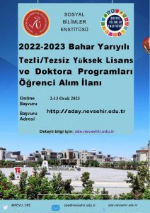 Sosyal Bilimler Enstitüsü 2022-2023 Eğitim – Öğretim Yılı Bahar Yarıyılı Lisansüstü Öğrenci Alım İlanına https://www.nevsehir.edu.tr/tr/37749 linkten ulaşılabilirsiniz.