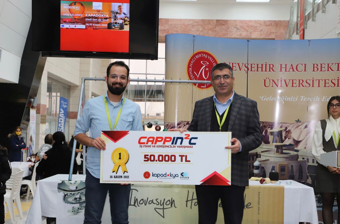 Yarışmacıların ödülleri Nevşehir Hacı Bektaş Veli Üniversitesi Vali Şinasi Kuş Kültür ve Kongre Merkezi’nde başlayan “STEM & Makers Fest/Expo Kapadokya” etkinliği kapsamında düzenlenen törenle verildi. Yarışmanın birincisi CAPPIN2C Kuluçka Merkezi girişimcisi Yunus Emre Ata’ya ödülünü Rektör Prof. Dr. Semih Aktekin, yarışmanın ikincisi Nevşehir Hacı Bektaş Veli Üniversitesi öğretim görevlisi Dr. M. Begüm Özen’e KOSGEB Nevşehir İl Müdürü Ali Usta ve yarışmanın üçüncüsü Abdullah Gül Üniversitesi Yüksek Lisans Öğrencisi Salih Yalçın’a ise ödülünü Hacettepe Üniversitesi öğretim üyesi Prof. Dr. Gültekin Çakmakçı verdi.