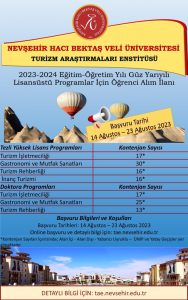 Nevşehir Hacı Bektaş Veli Üniversitesi (NEVÜ) Turizm Araştırmaları Enstitüsü, 2023-2024 Eğitim – Öğretim Yılı Güz Yarıyılı için 79’u tezli  yüksek lisans ve 55’i de doktora olmak üzere toplam 134 öğrenci alacak. Ayrıca Nevşehir Hacı Bektaş Veli Üniversitesi Lisansüstü Eğitim-Öğretim Yönetmeliğinin 9. maddesi uyarınca yatay geçiş yoluyla Anabilim Dallarına yüksek lisans ve doktora öğrencilerini kabul edecek.