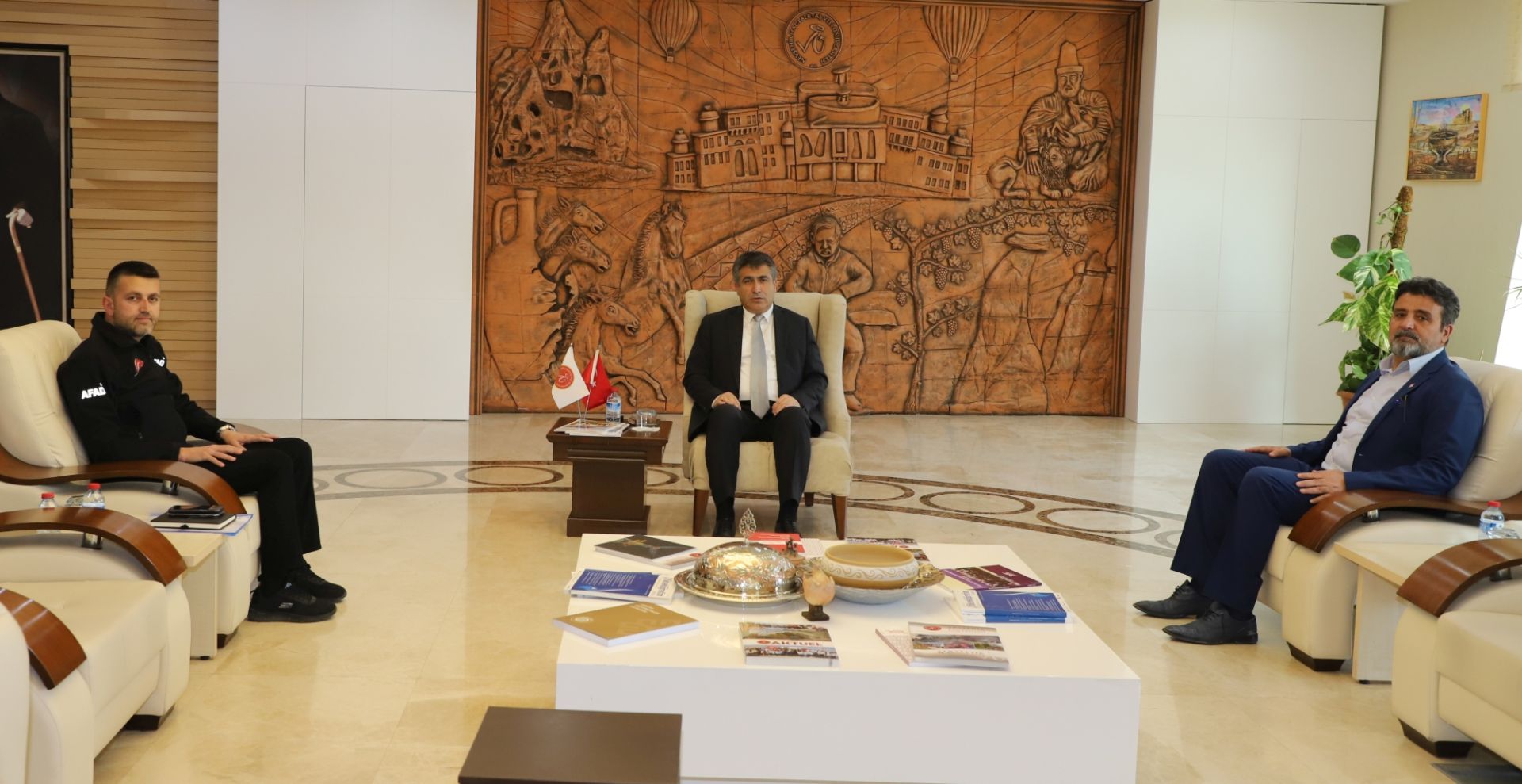 Nevşehir Valiliği İl Afet ve Acil Durum Müdürü Yasin Tokgöz, NEVÜ Rektörü Prof. Dr. Semih Aktekin’i makamında ziyaret etti. NEVÜ Genel Sekreteri Nihat Çavuşoğlu’nun da hazır bulunduğu ziyarette Toksöz, kurulan birim koordinasyonunda yürütülecek ortak çalışmalar ve projeler hakkında kendilerine bilgi verdi.