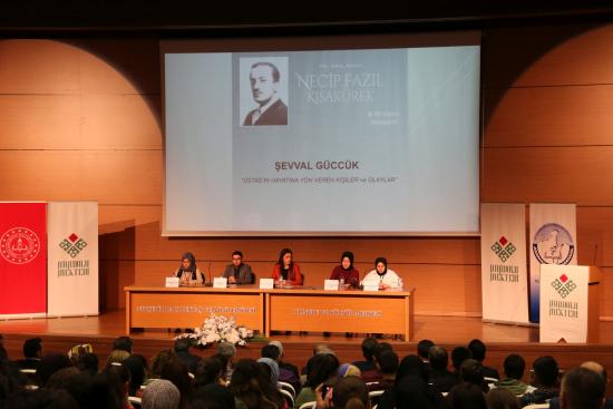 Program saygı duruşu ve İstiklal Marşı’nın okunmasının ardından program, Anadolu Mektebi Yazar Okumaları faaliyetleri kapsamında gönüllü öğrencilerin Necip Fazıl Kısakürek’le ilgili değerlendirme yazılarını sunduğu panelle başladı.