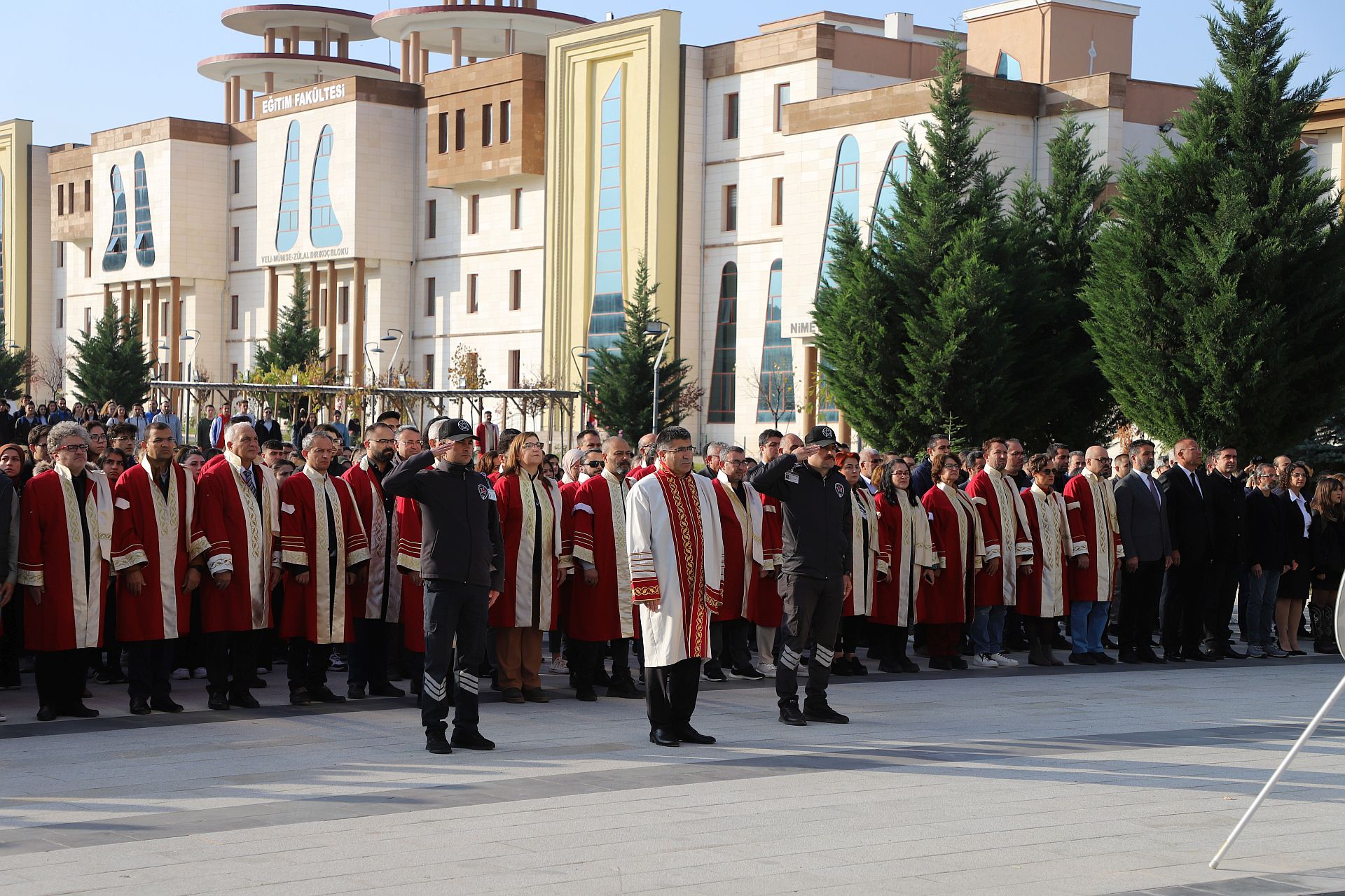 Rektör Prof. Dr. Semih Aktekin’in Atatürk heykeli önüne üniversitenin çelengini bırakmasıyla başlayan tören Gazi Mustafa Kemal Atatürk’ün ebediyete irtihali olan saat 09.05’te, Atatürk, silah arkadaşları ve tüm aziz şehitler için iki dakikalık saygı duruşunun ardından İstiklal Marşı’nın okunmasıyla sona erdi.