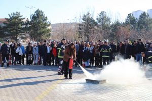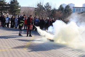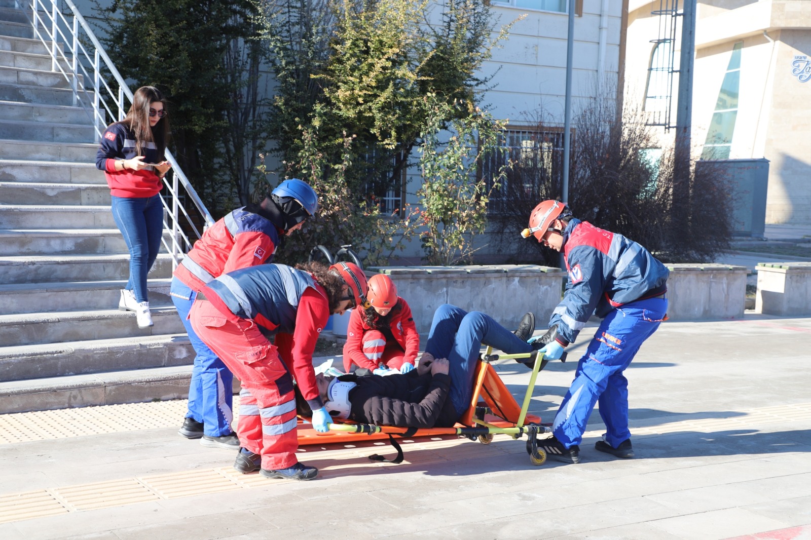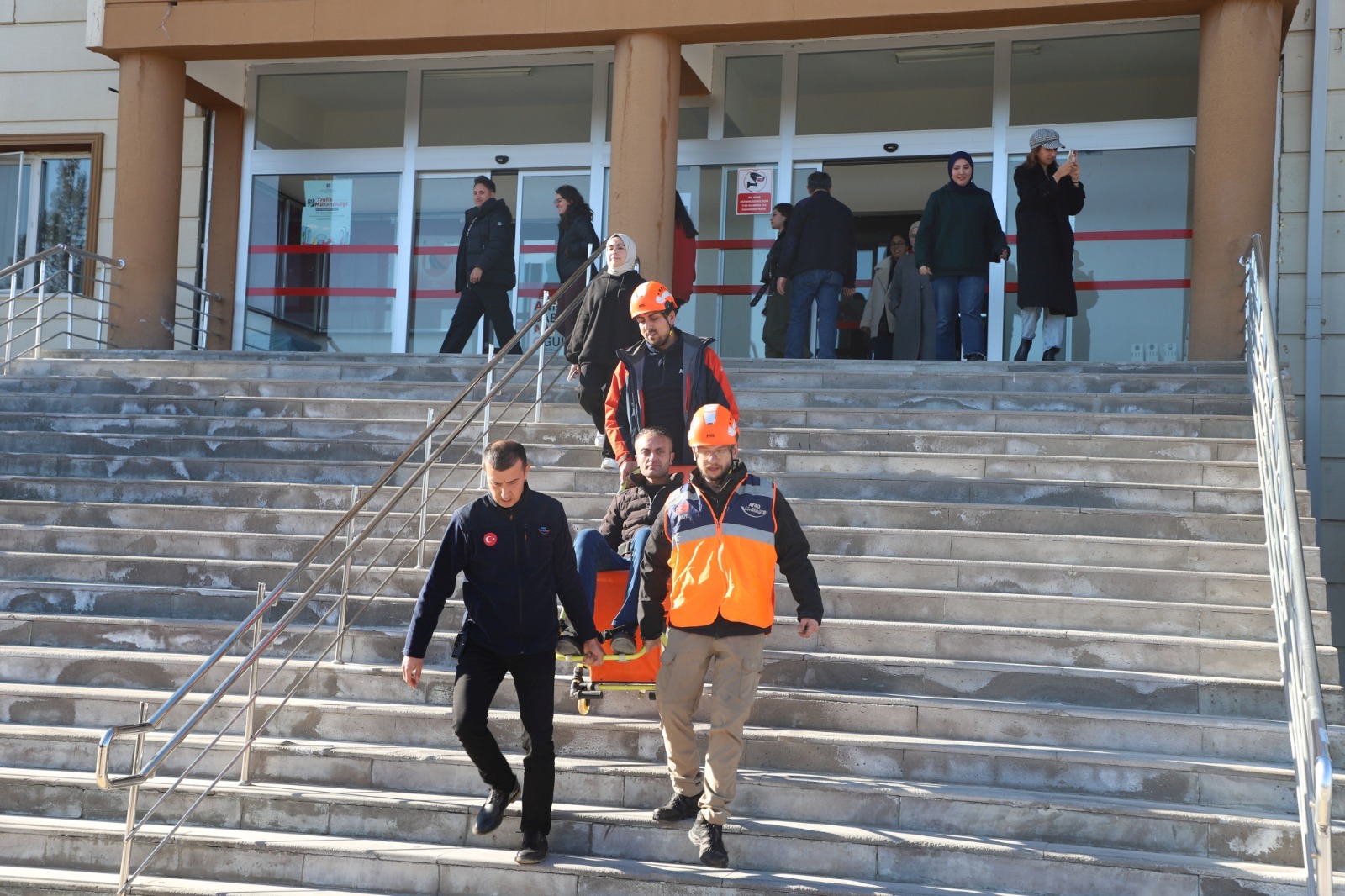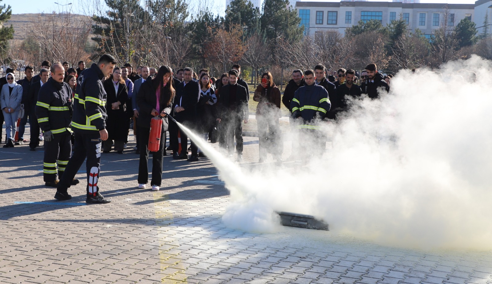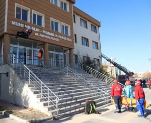 Mühendislik- Mimarlık Fakülte binasında olası yangın, tahliye ve yaralı kurtarma tatbikatı, merkez büyük otopark alanında ise yangın söndürme eğitimi gerçekleştirildi. Tatbikatta, binada mahsur bulunan kişiler, AFAD, itfaiye ve UMKE ekipleri tarafından kurtarılarak sağlık kuruluşlarına sevk edildi. Ayrıca olası bir yangın durumunda yapılması gerekenler ve yangın ekipmanlarının doğru kullanımı hakkında bilgilendirilen personel ve öğrenciler, daha sonra alandaki yangını gerekli yangın ekipmanlarıyla söndürdü.