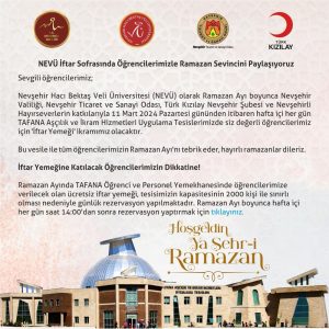 Öğrencilere yönelik düzenlenen iftar programının ‘Üniversite-Şehir’ dayanışmasının en güzel ve en iftihar edilecek örneklerinden biri olduğunu söyleyen NEVÜ Rektörü Prof. Dr. Semih Aktekin, “Nevşehir Hacı Bektaş Veli Üniversitesi olarak ‘Ramazan Ayı’ boyunca Nevşehir Valiliği, Nevşehir Ticaret ve Sanayi Odası, Türk Kızılay Nevşehir Şubesi ve Nevşehirli hayırseverlerimizin katkıları ile 11 Mart 2024 Pazartesi gününden itibaren hafta içi her gün NEVÜ Tafana Aşçılık ve İkram Hizmetleri Uygulama Tesislerimizde öğrencilerimiz için ücretsiz ‘İftar Yemeği’ ikramlarımız olacaktır.