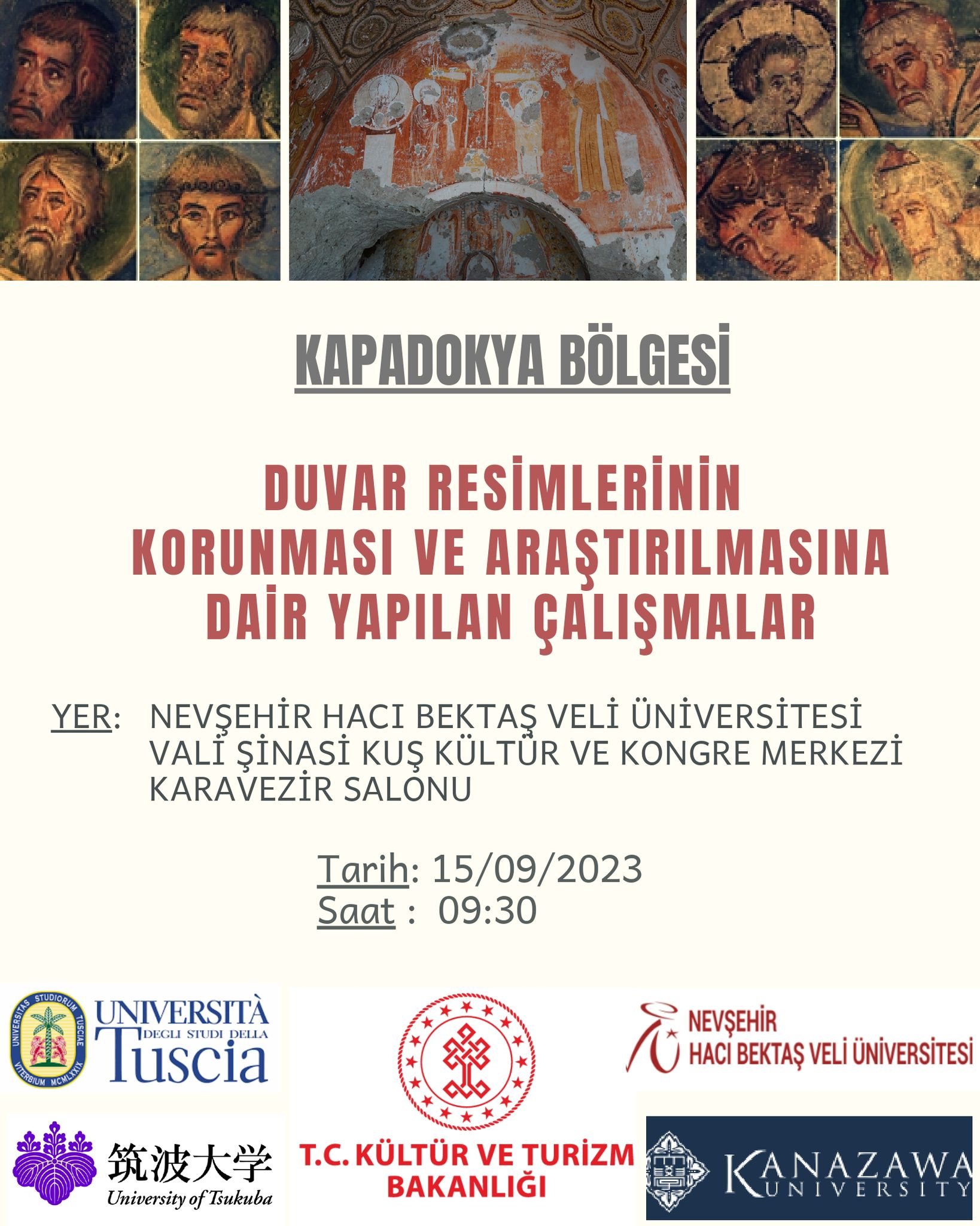 15.09.2023 Cuma günü NEVÜ Vali Şinasi Kuş Kültür Kongre Merkezi Karavezir Salonu’nda düzenlenecek olan konferansta; Kapadokya Alan Başkanlığı ile Nevşehir ve Ürgüp Müze Müdürlüğü sorumluluk alanında bulunan kültürel miras niteliğindeki tarihi kiliselerde Kültür ve Turizm Bakanlığı izniyle Japon ve İtalyan araştırmacılar ile NEVÜ Mühendislik Mimarlık Fakültesi Jeoloji Mühendisliği ve Fen Edebiyat Fakültesi Sanat Tarihi Bölümleri tarafından duvar resimlerinin korunmasına ve restorasyonuna yönelik olarak yapılan projelerin tanıtımı yapılacak.