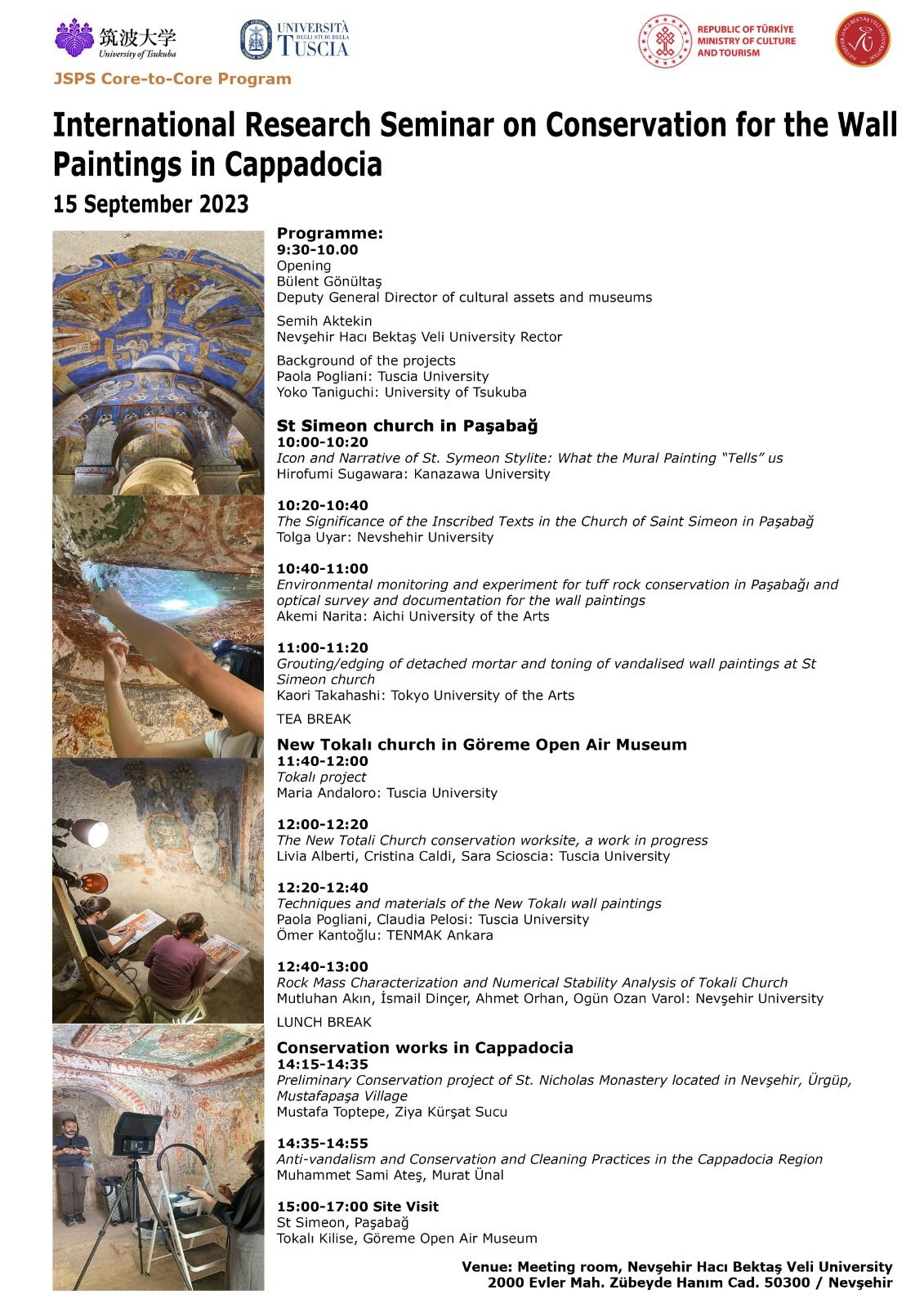 Japonya’da bulunan Tsukuba Üniversitesi’nden Doç. Dr. Yoko Taniguchi ve ekibi Nevşehir İli Avanos İlçesi Aziz Simon Kilisesi duvar resimlerinde yapılan konservasyon çalışması, Japonya Kazanawa Üniversitesi’nden Doç. Dr. Hirofumi Sugawara Kapadokya Bölgesi’ndeki bazı kiliselerin duvar resimlerinin üç boyutlu sanal gerçeklik ortamına aktarılması konusunda sunumlarda bulunacak. İtalya’da bulunan Tuscia Üniversitesi’nden Prof. Dr. Maria Andaloro ve ekibi ise Nevşehir İli Merkez İlçesi Göreme Açık Hava Müzesi’nde bulunan Tokalı Kilisesi duvar resimlerinin konservasyonu hakkında bilgi verecek.